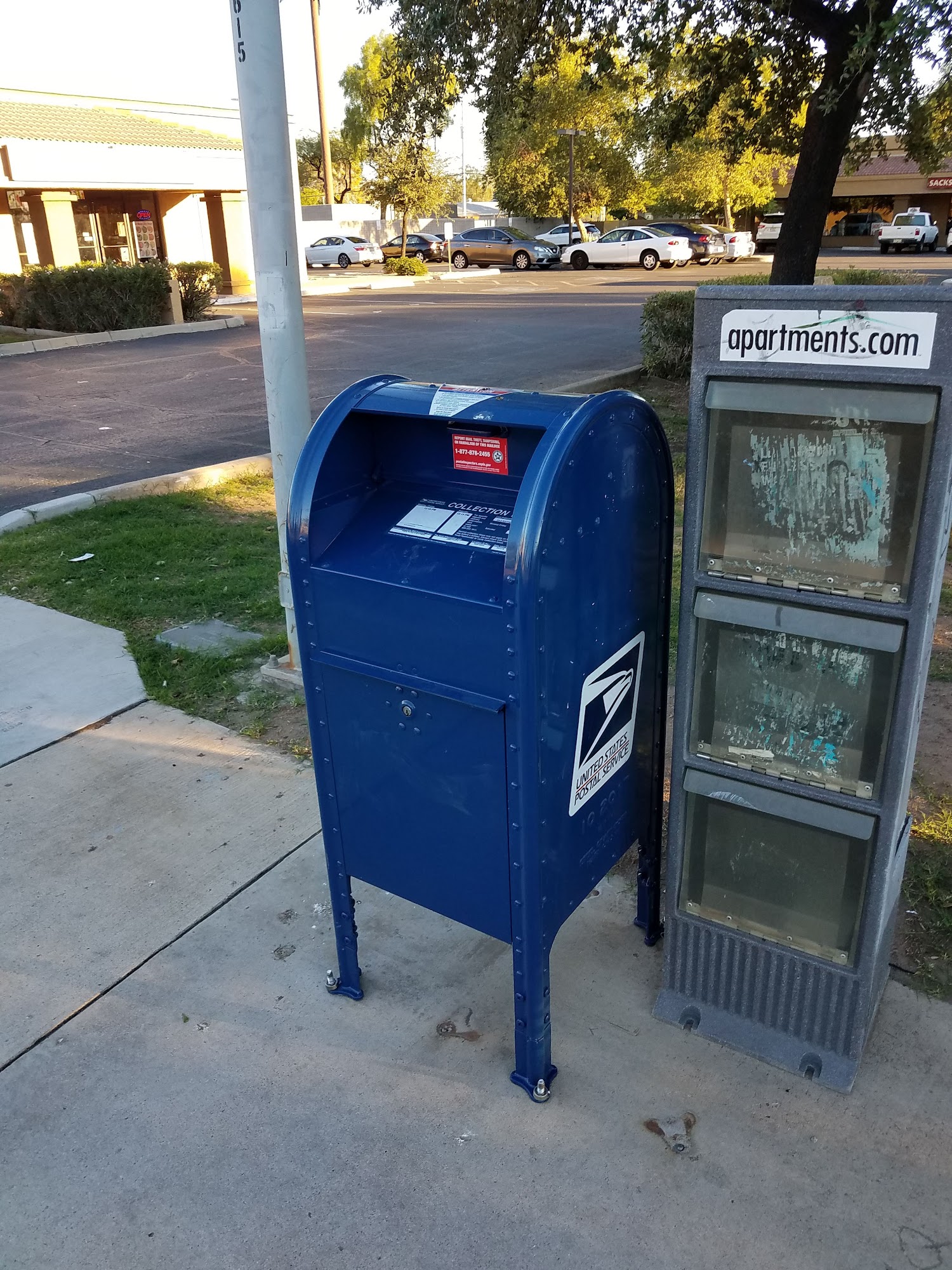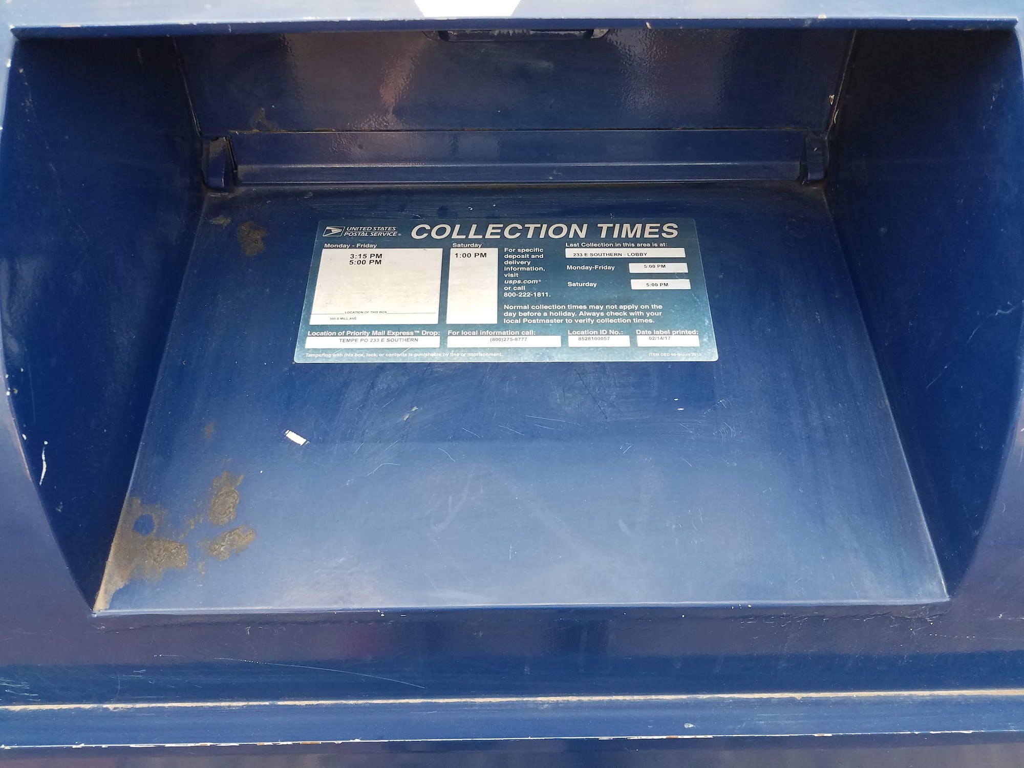 Collection times are M-Sat 12:15 pm. This is not a drive-up box.
