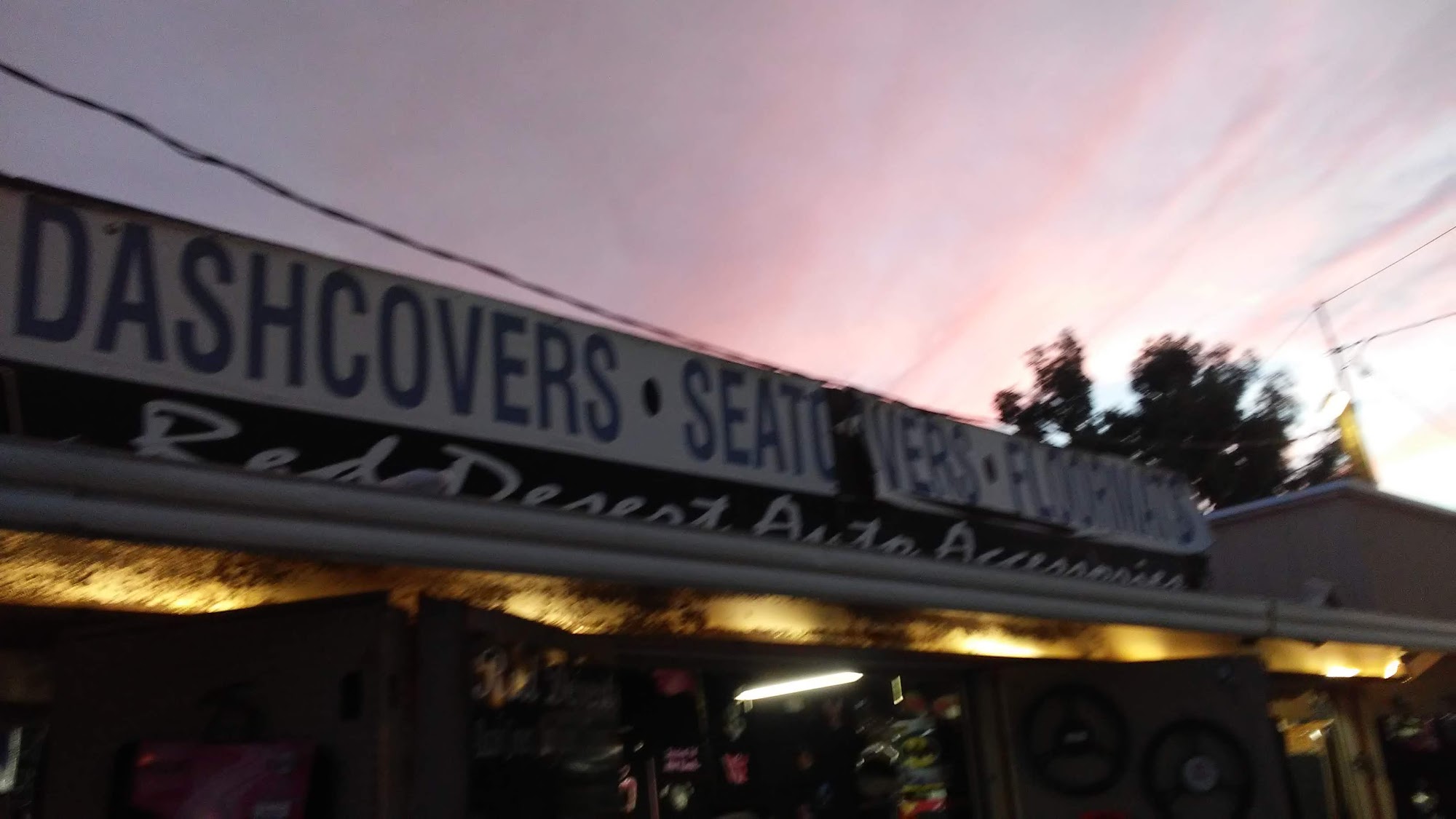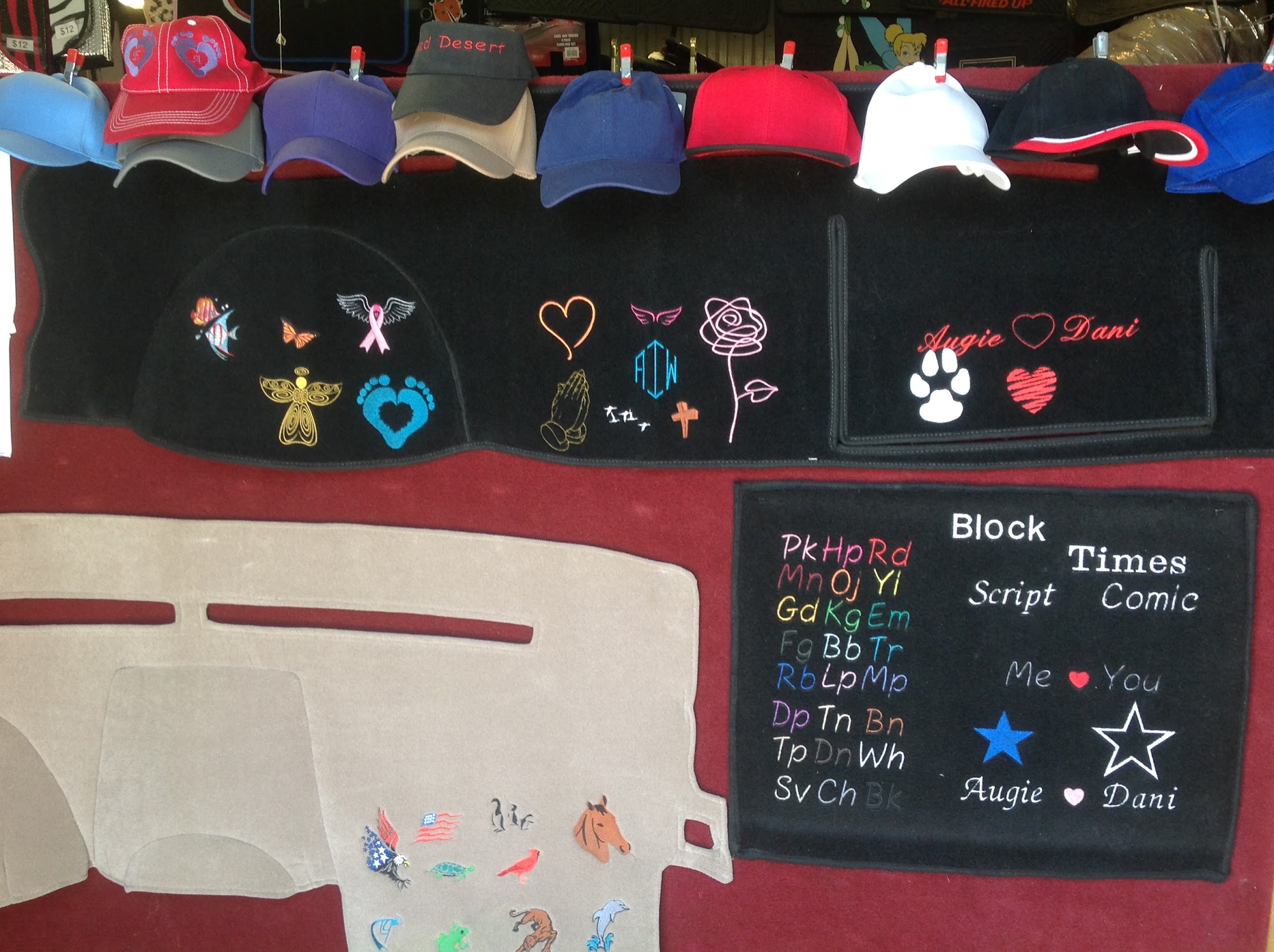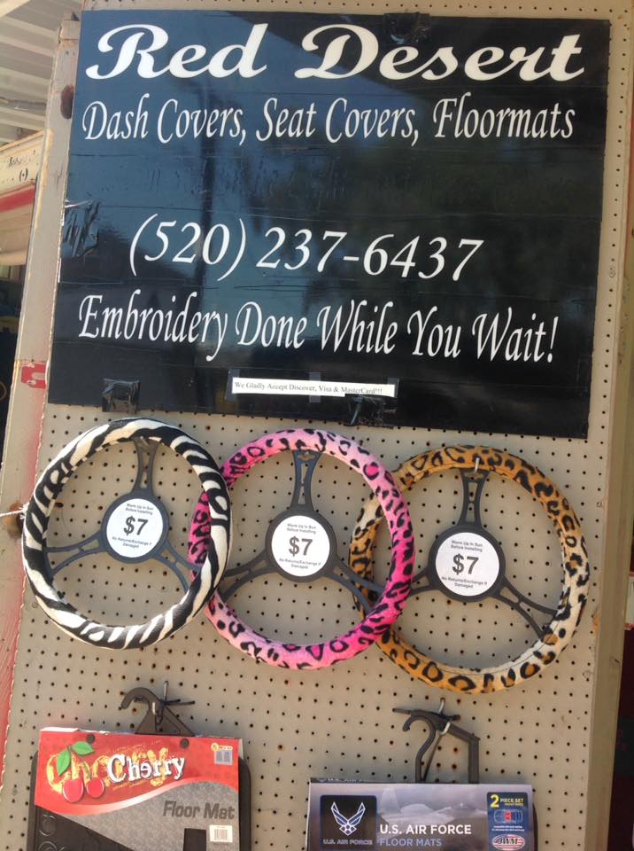 We sell Dash covers, Seat Covers, Floormats and other interior car accessories. Dash covers can be embroidered in as little as 10mins. We are located in the Tanque Verde Swap Meet, if you are coming to enjoy the swap meet the best times are Fri and Sat 6-9pm. All others times are very slow, which is great if you are only coming to see us but very few of the other businesses will be open.