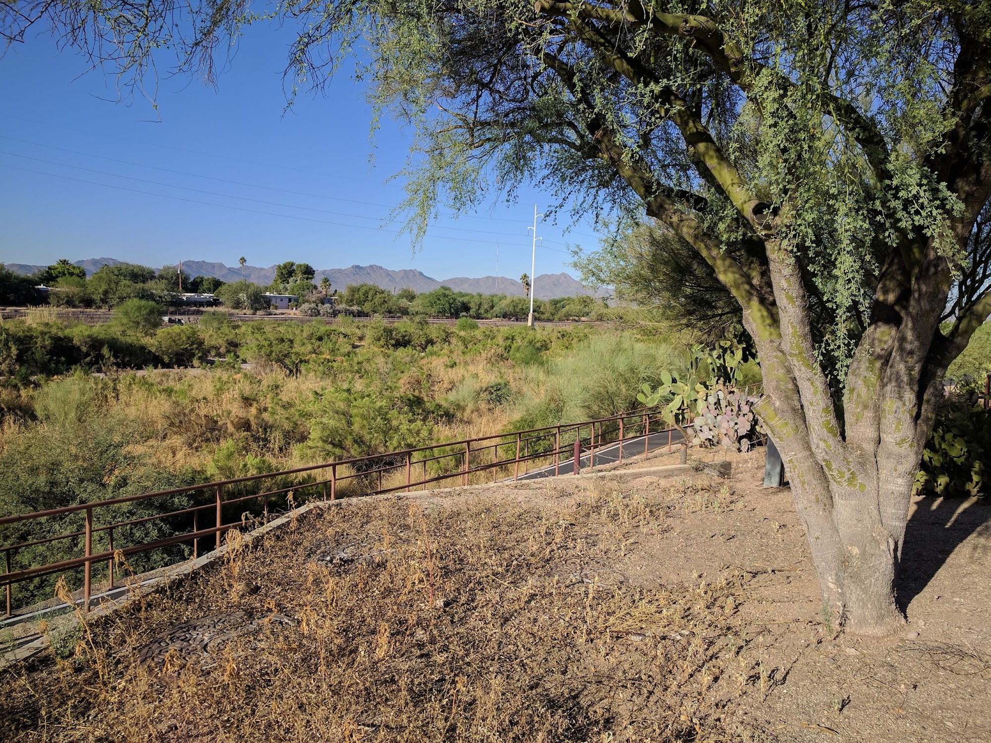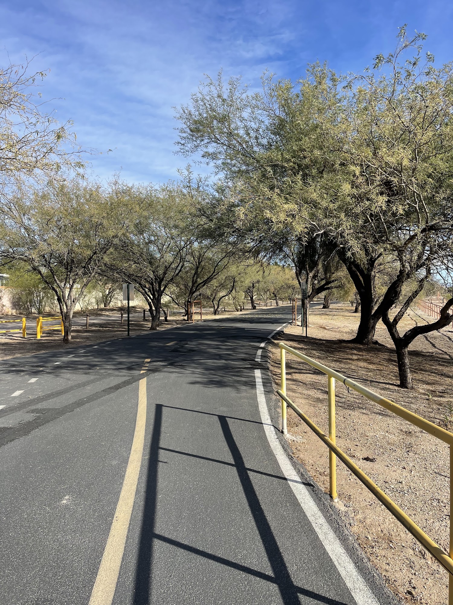 Rillito River Park at La Canada offers a peaceful place to walk or ride with nice wide paved trails. It is a perfect stop along the loop, far enough from the city to be quiet and probably safe for kids. Many enjoy the nature, the quietness, and the beautiful wash, especially during monsoon. The smaller loop is just over a mile with longer options available. There is plenty of parking close to restaurants and shopping. Visitors recommend coming early in the morning for a peaceful walk and note it is dog-friendly with stations near grassy areas. However, it is important to be aware of surroundings. There can be homeless individuals and occasional unsafe activity, so it is advised to protect valuables. The bathrooms may not be safe. Watch for venomous creatures and bring water, a hat, and sunscreen as it heats up fast.