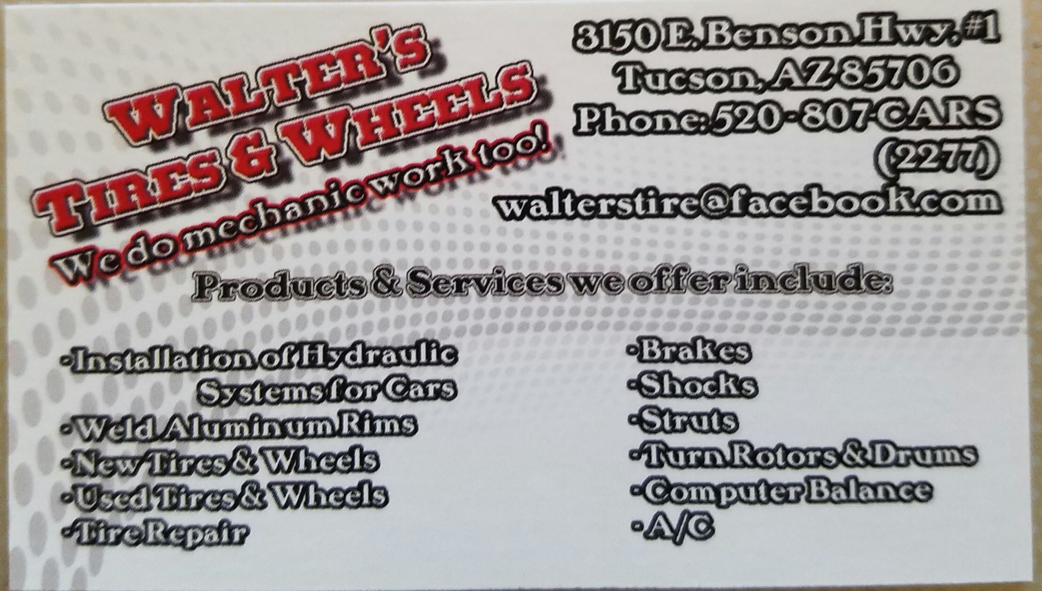 Walters Tire is the best tire shop in town. The staff are super nice, friendly, helpful, professional, and very efficient. They serve customers quickly, with short wait times. People are often in and out in a jiffy, sometimes in 20 minutes, even without an appointment. They provide great prices and reasonable repair costs for simple tire repairs and other vehicle work. Customers highly recommend this place to anyone, calling it the best place in Tucson for honest and great service.
