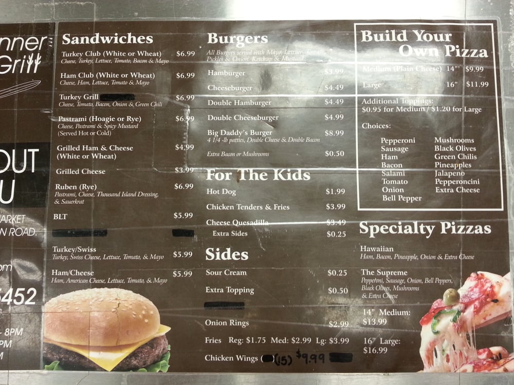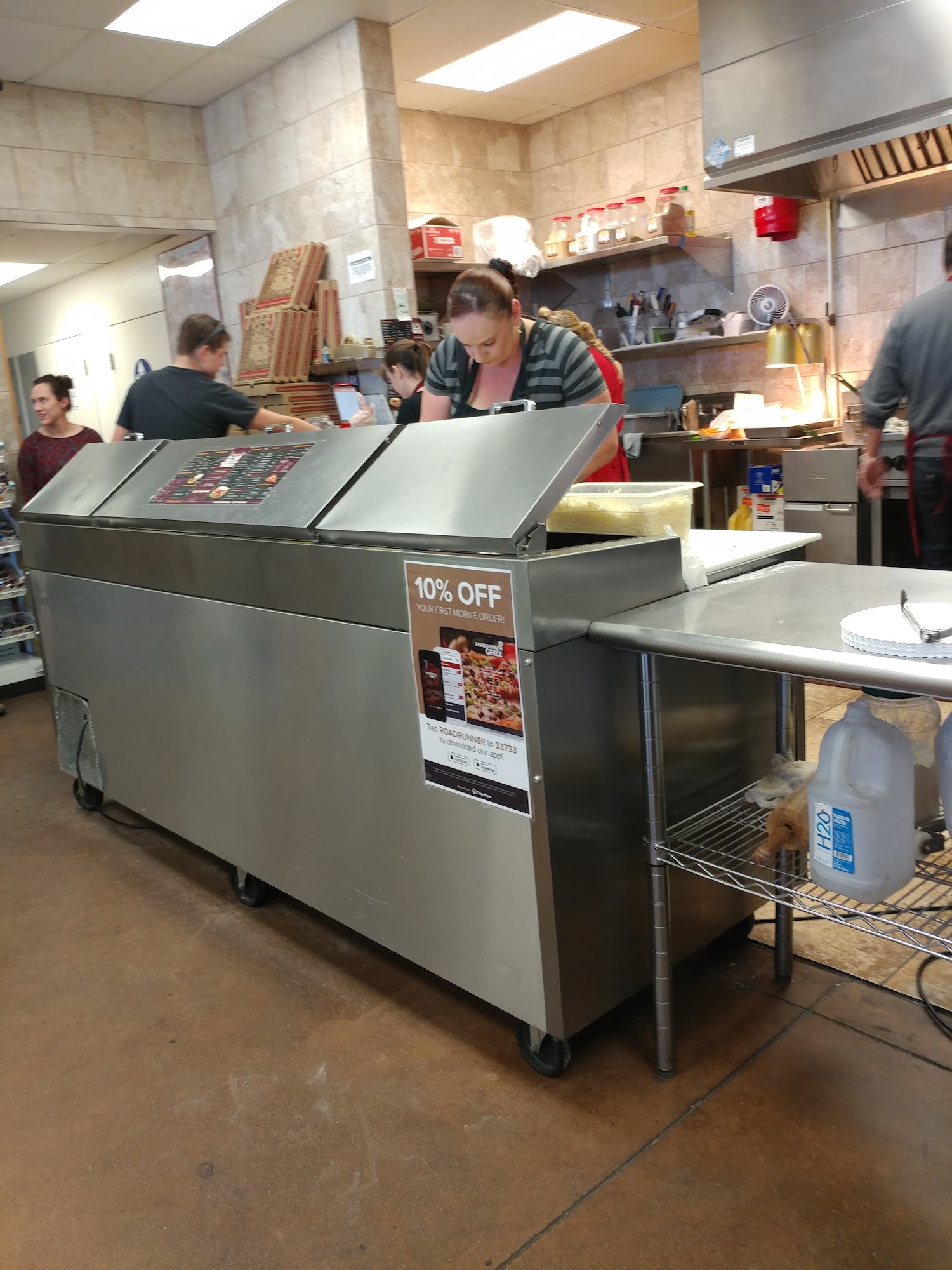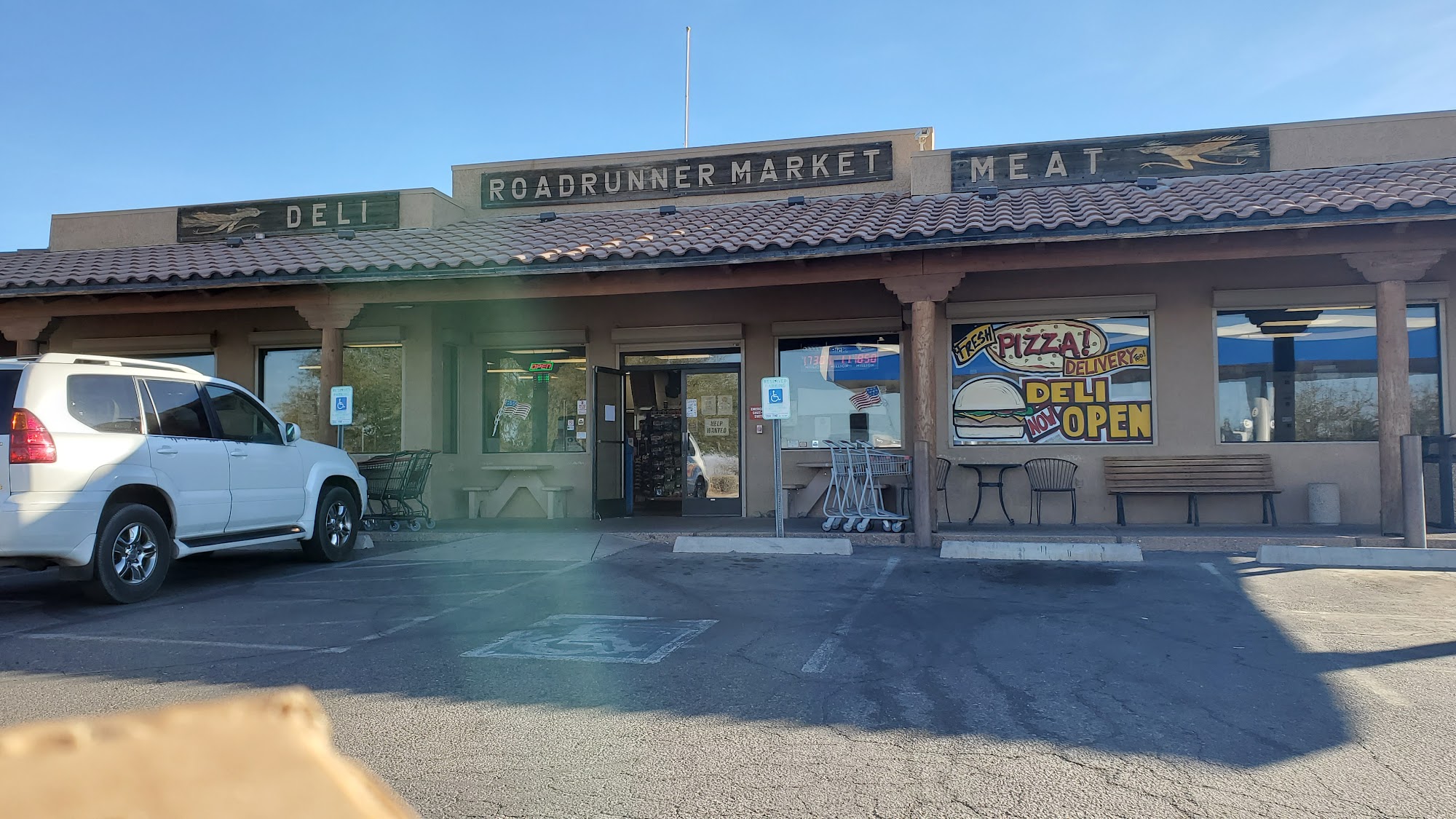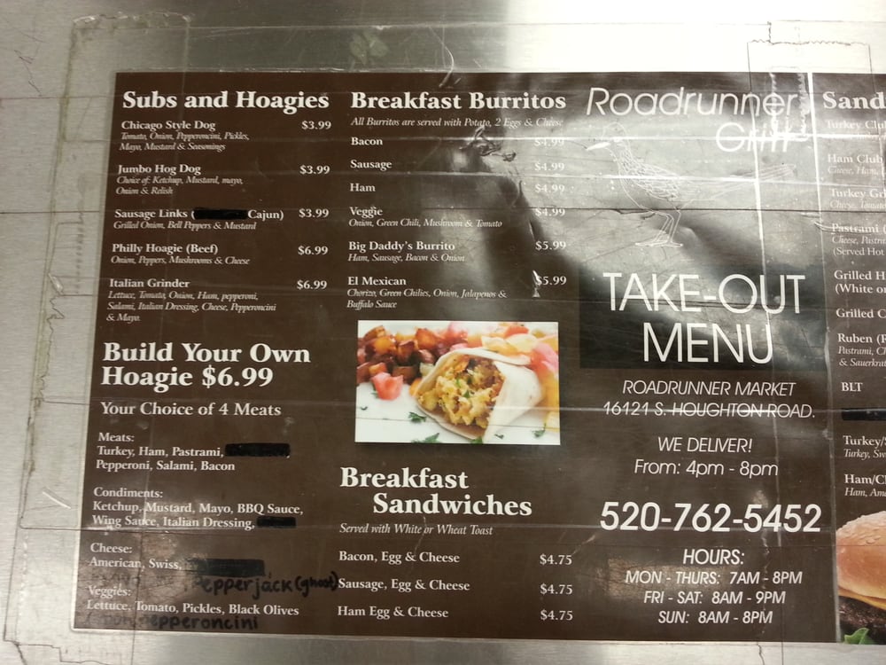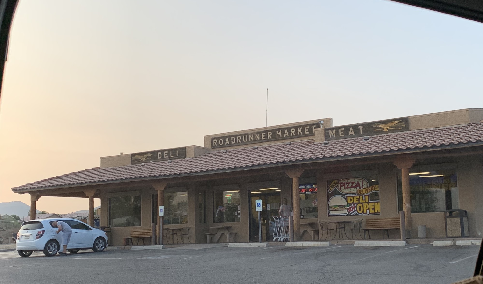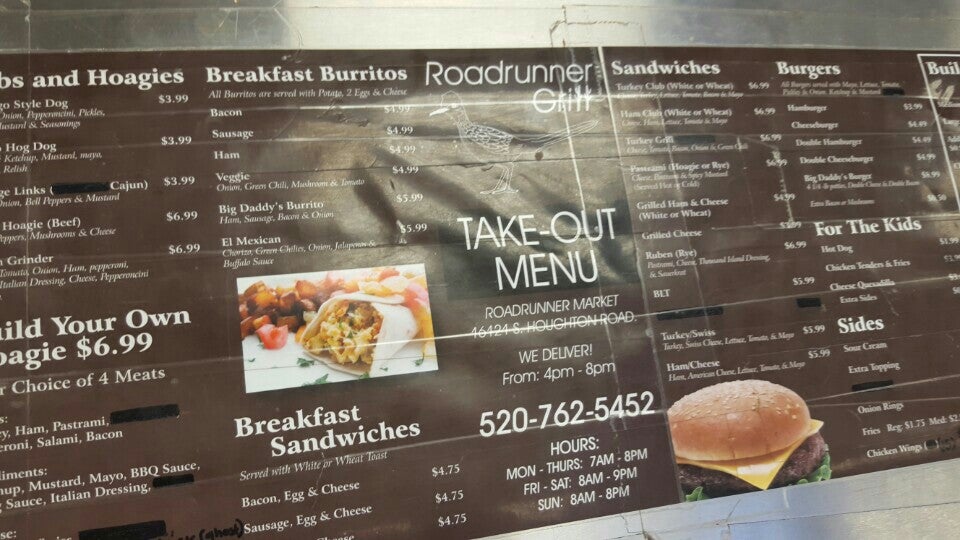 Roadrunner Market Grill is a busy, full-service convenience stop and grill on a lonely road. It offers gas, restrooms, and a full convenience store. The grill serves excellent hand-tossed pizzas, grilled sandwiches, burgers, hot dogs like the Chicago Dog, and breakfast burritos. There is lots of variety and plenty of parking. The staff is friendly, nice, and helpful, keeping the line moving quickly even when supper busy. It is a bit expensive but very convenient where not much else is around. Seating space is limited, so eating in your car is best.