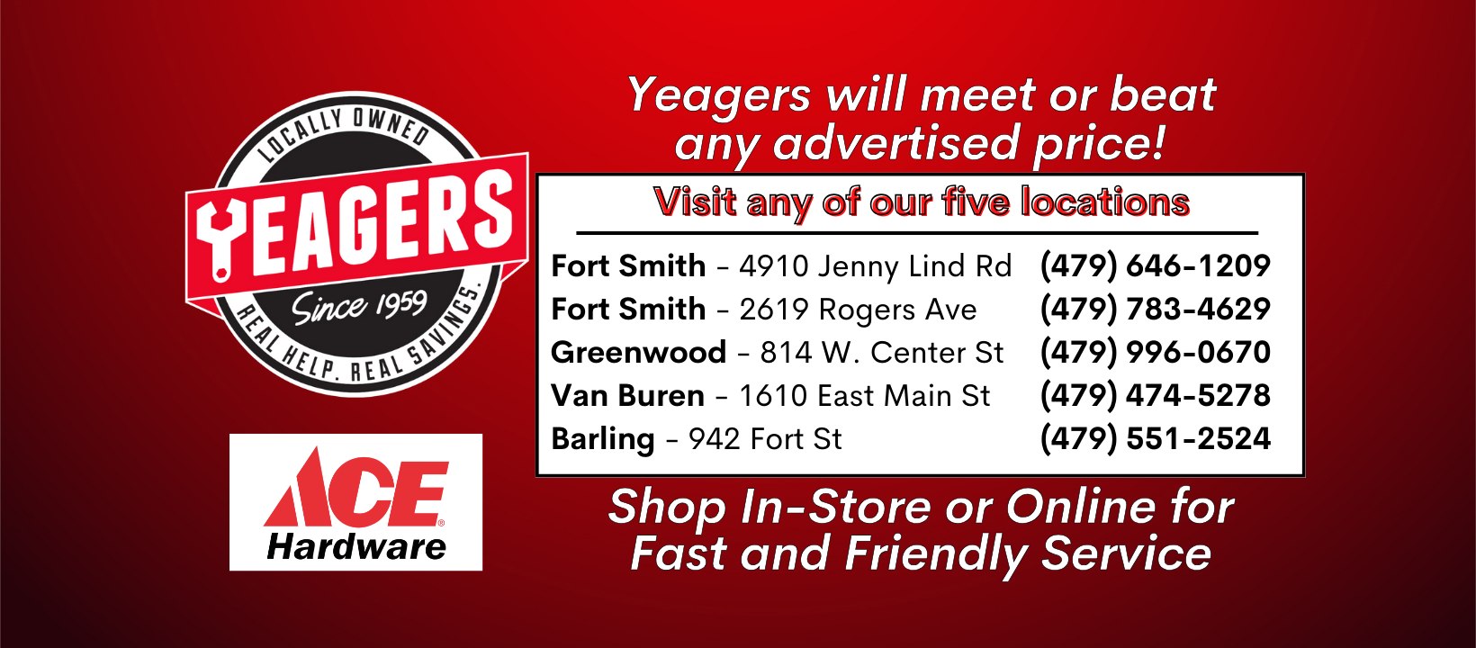 Yeager Hardware is a locally owned and operated Ace Hardware, committed to being a helpful part of the community. The store is built and designed just for Ace, described as a must-see, and is very clean, bright, well-organized, and easy to maneuver. It offers an amazing and good selection of quality products. The service is exceptionally friendly, helpful, and personal, with patient and excellent associates always ready to assist customers with a smile. As the helpful hardware folks in the neighborhood, the store provides a convenient shopping experience from local experts, making it the place to go for those seeking good personal service.
