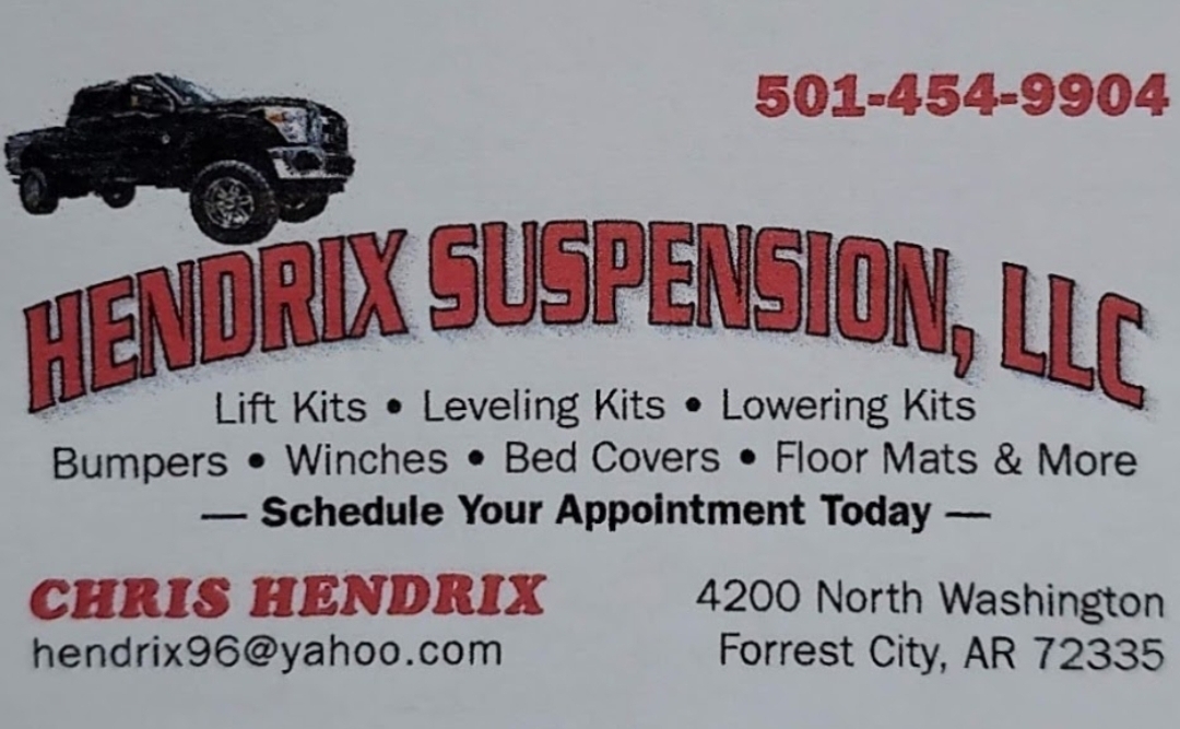 Hendrix Suspension, LLC is known for high-quality work and competitive pricing. Chris, the owner, has extensive knowledge of vehicle upgrades and provides excellent customer service. Customers appreciate the fast turnaround for services like lift installations and suspension work, often noting minimal wait times. Many have had multiple vehicles serviced, including trucks and side-by-sides, and consistently recommend Chris for his outstanding service. Whether it's a leveling kit, winch installation, or other vehicle accessories, Hendrix Suspension is the go-to place for reliable and efficient service.