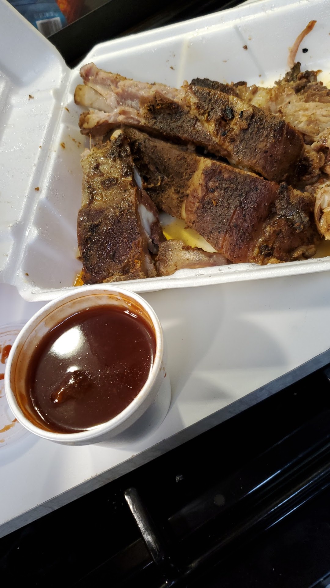 We stopped for beer, and they have a nice selection. The real star is the RIBS. We had just had breakfast, but they smelled so good we got some anyway. They were falling off the bone and didn't even need sauce. The sauce that came on the side was really good, and sweet, so I ate about half with and half without.