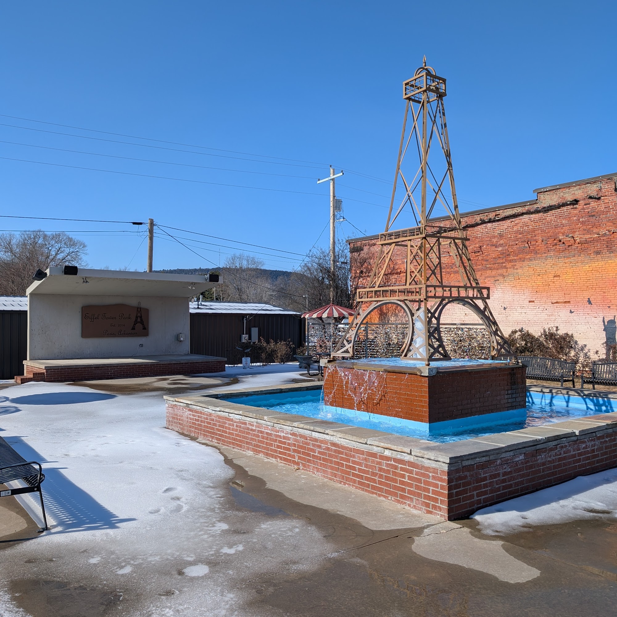 Eiffel Tower Park is a charming outdoor destination located in a small town. The park features an 8/10 mile paved walking trail with a bike lane and exercise stations, a large playground, a pavilion, public restrooms with drinking water, basketball courts, and soccer fields, making it an ideal spot for picnics and outdoor recreation. The town is known for its festive holiday decorations, and the park's unique shops and pleasant employees add to the overall pleasant experience. Visitors can enjoy the picturesque setting, including the Eiffel Tower replica and a "love lock" bridge, similar to the one in Paris, France. While not a must-visit destination on its own, Eiffel Tower Park is a delightful stop for those passing through the area, offering a relaxing and photo-worthy experience.