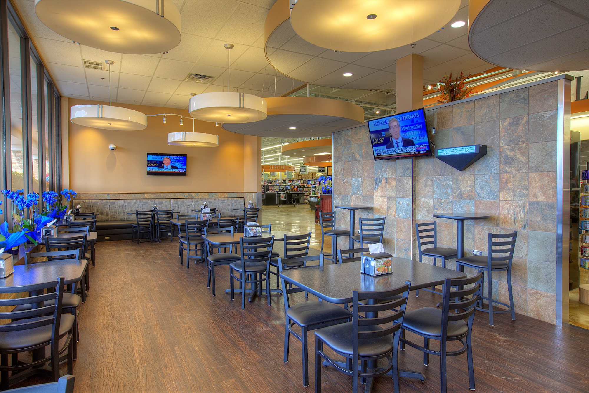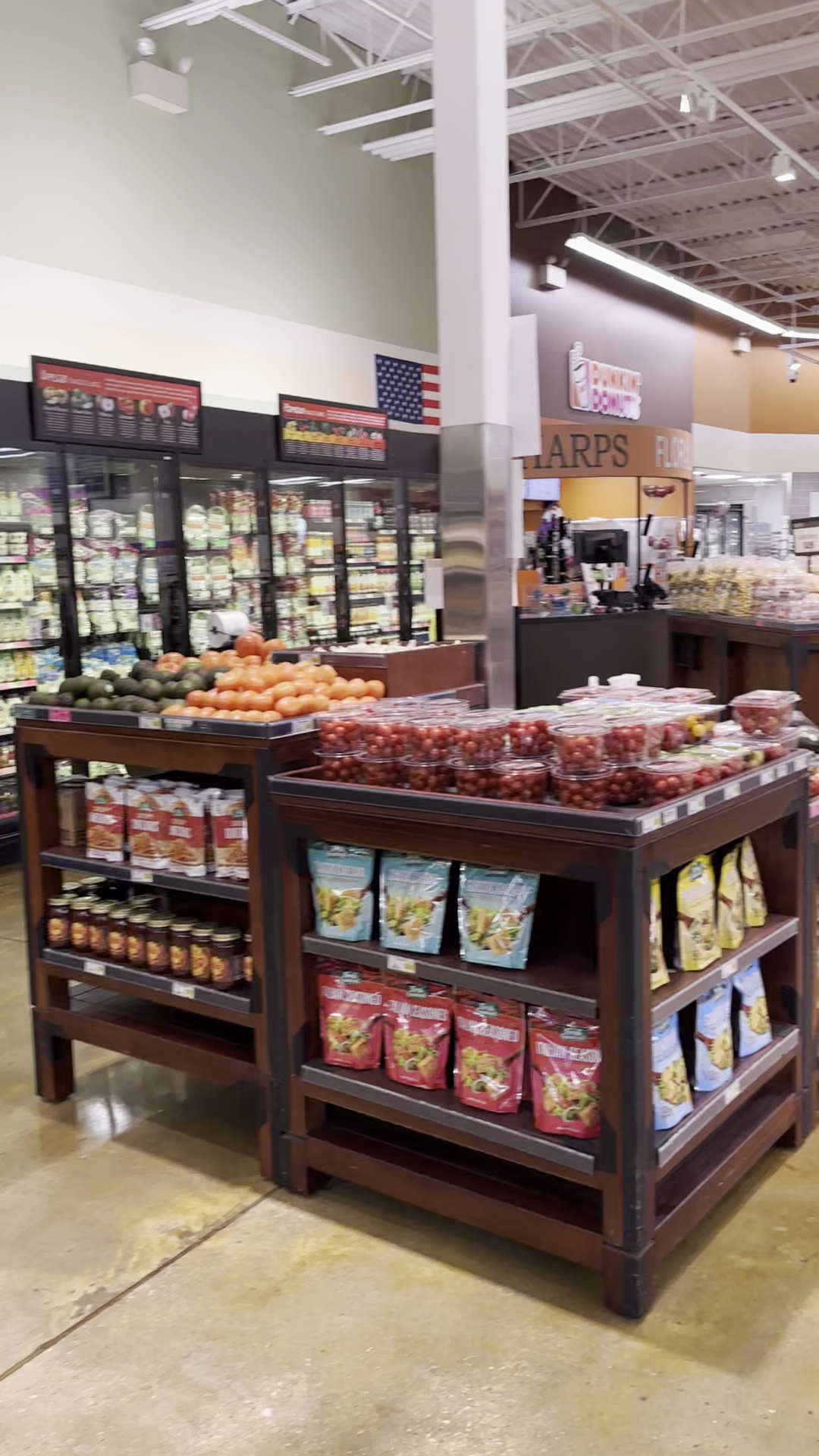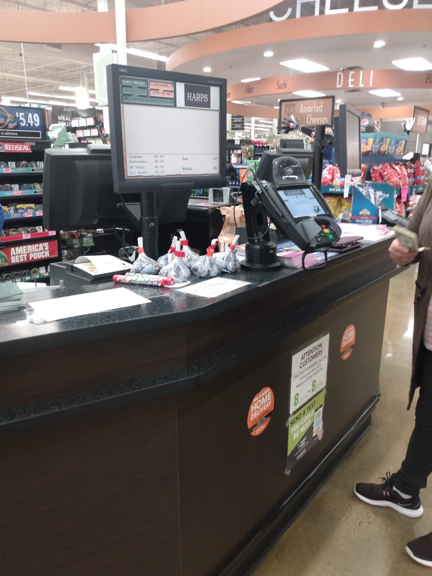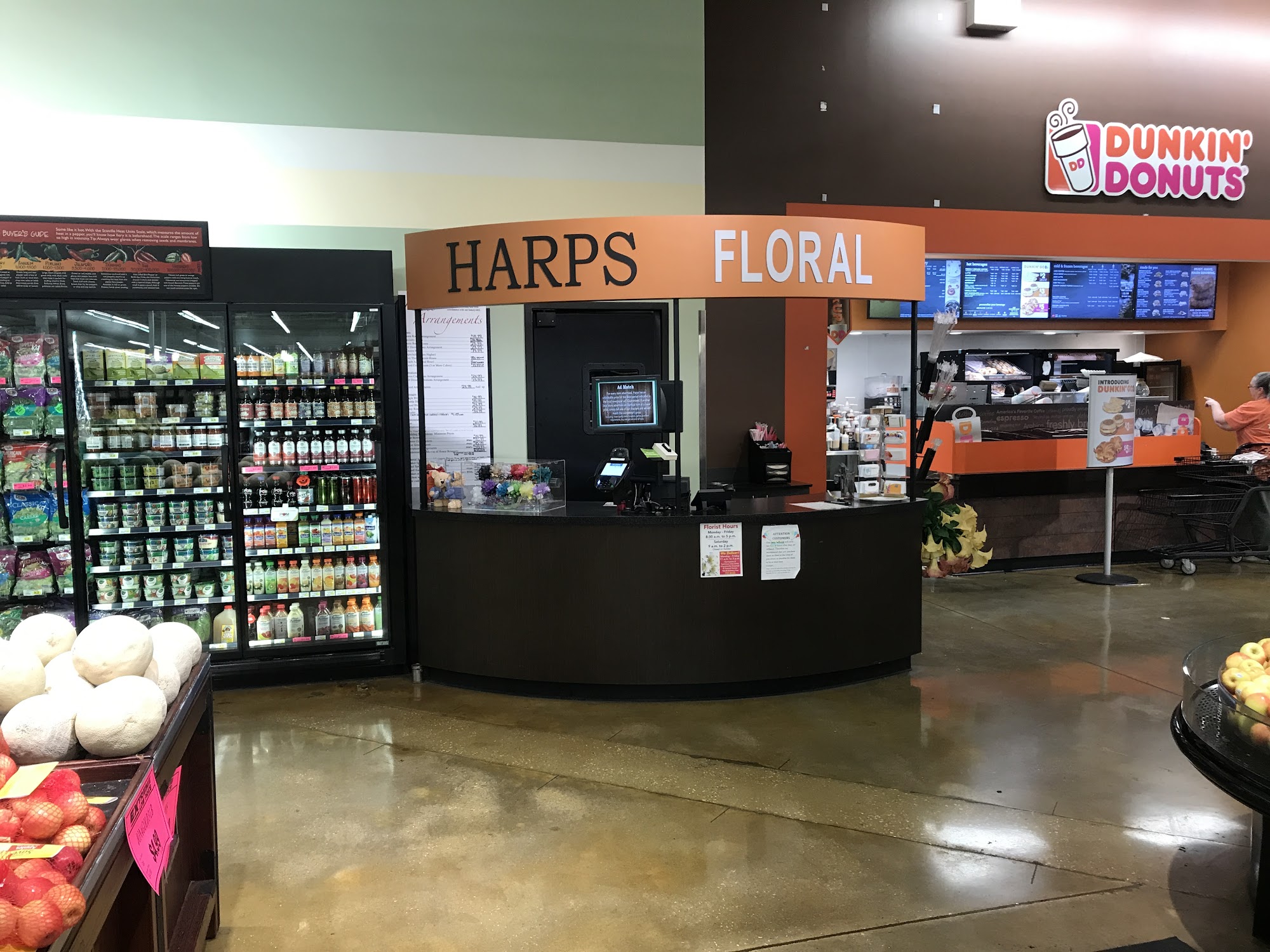 Harps Food Stores is a great place that many customers find better than Walmart. The store has a pleasant atmosphere and a nice seating area up front. It is well organized, with everything on the shelves labeled facing forward, clean, and with amazing selections. The pharmacy is praised for being great, with staff who take time to get to know their clientele and make them feel like family. The deli department helps with last minute catering orders, working customers in and getting it done. The store offers fresh sushi made daily in-house, Dunkin Donuts inside, and high quality meats and cheeses. Staff are professional and willing to help.