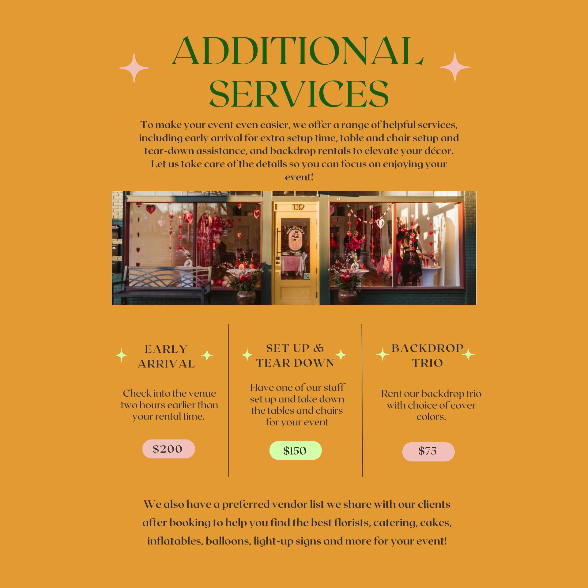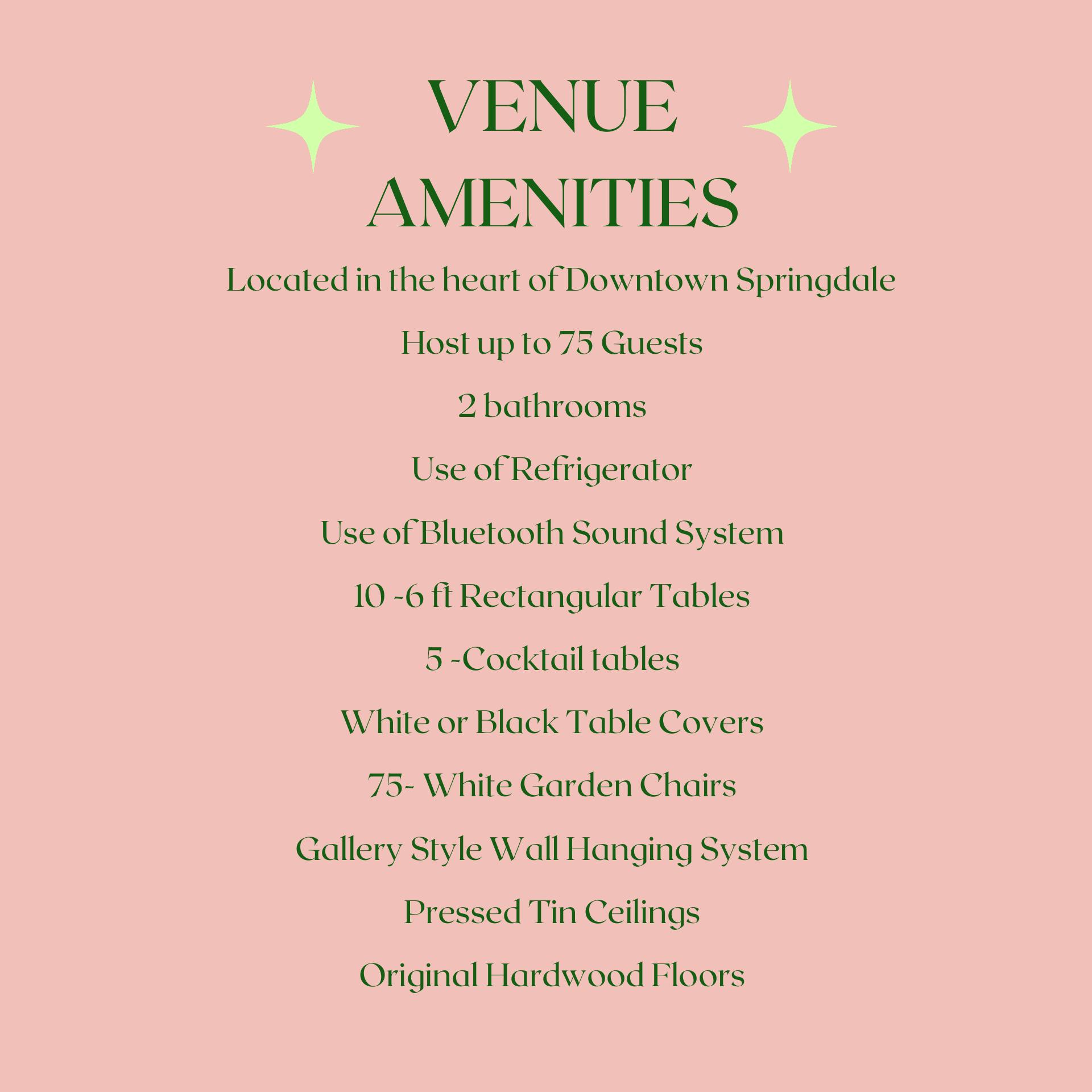 Mano's on Emma is a truly amazing space! A perfect venue for almost any need. Exceptional service provided by the owners/event space in regards of communication and setup. It's amazing to have a space with historic charm that offers high-quality service in the community of Springdale!