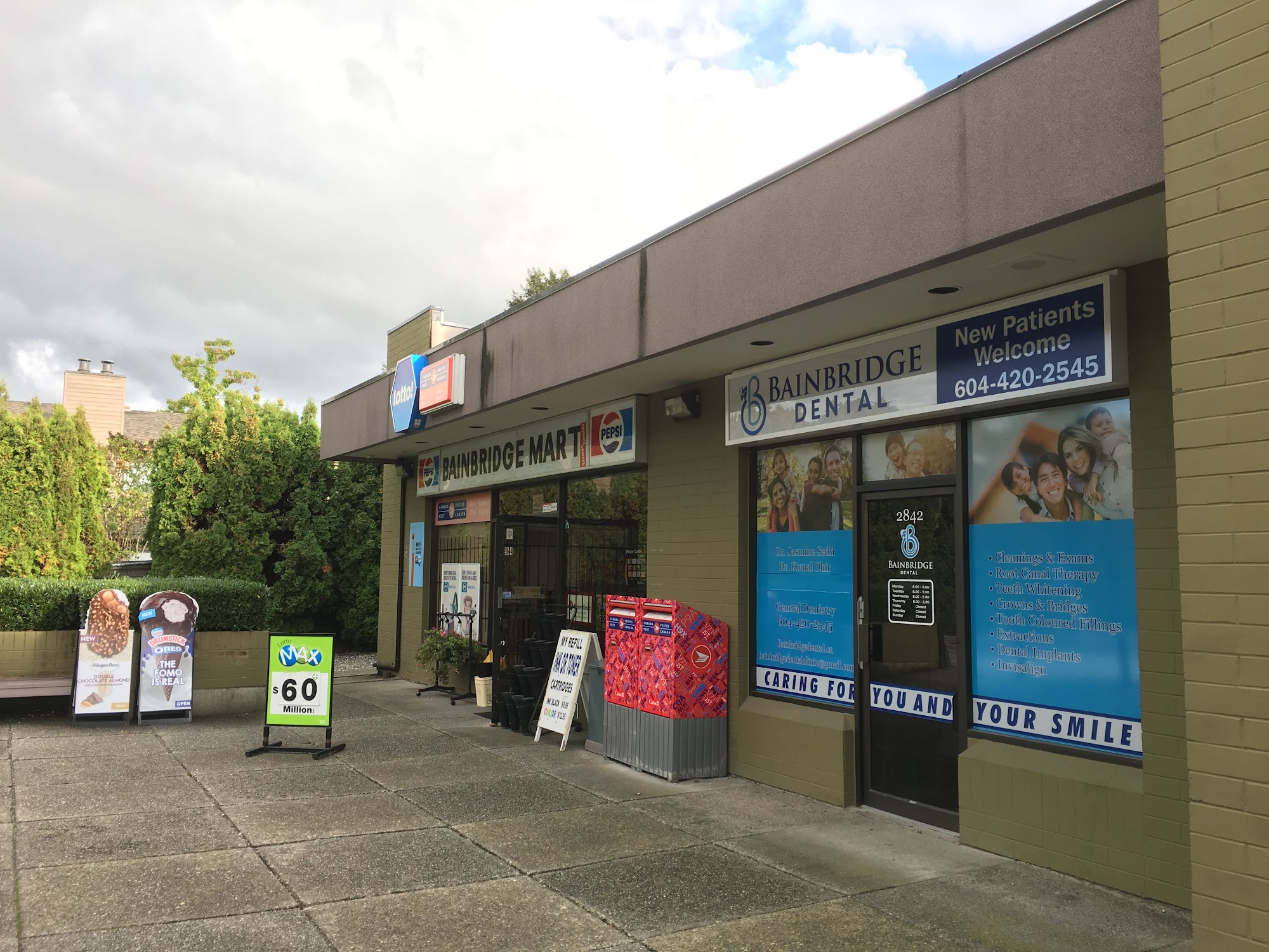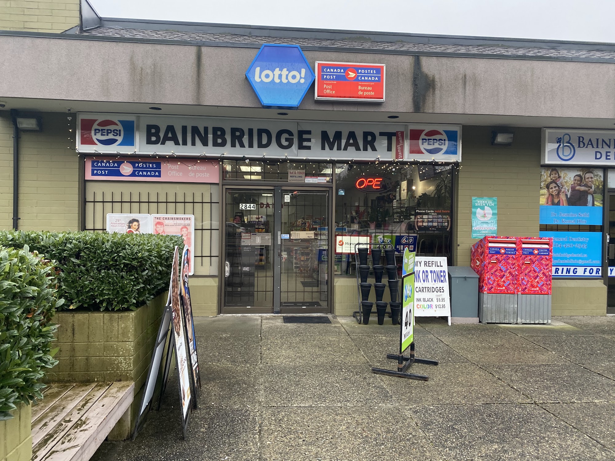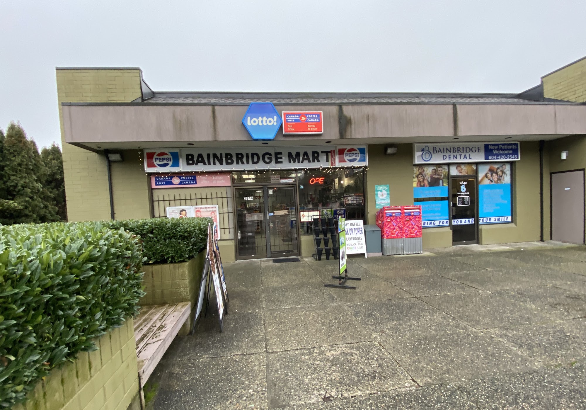 Bainbridge Mart is a friendly neighborhood convenience store and Canada Post outlet that has been around since the early 90s, making it a relic in the neighborhood. It is a nice little tucked away store where one clerk often efficiently works both tills. Customers can grab simple daily items like pop, chips, and candy, as well as things for house and home. The Canada Post service is a major feature, helpful for sending mail and Amazon returns, though it can get busy with a bit of a wait. The owners are described as friendly and polite, with a long-standing presence. The store has parking for over ten cars and maintains a good neighborly feel.