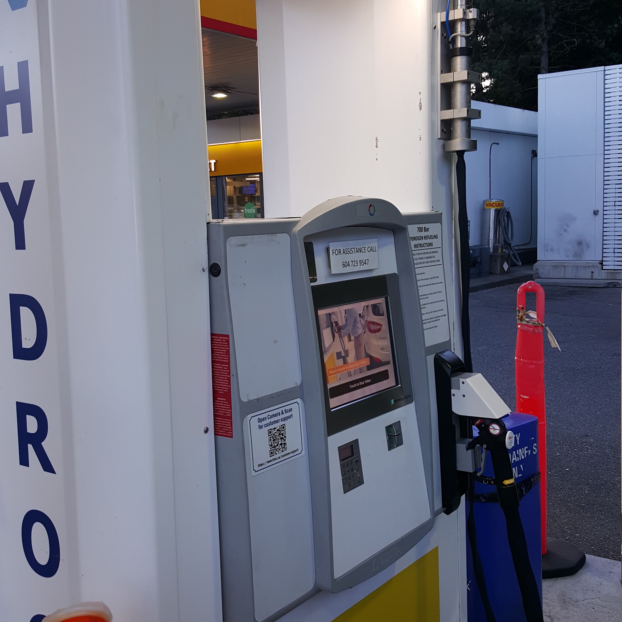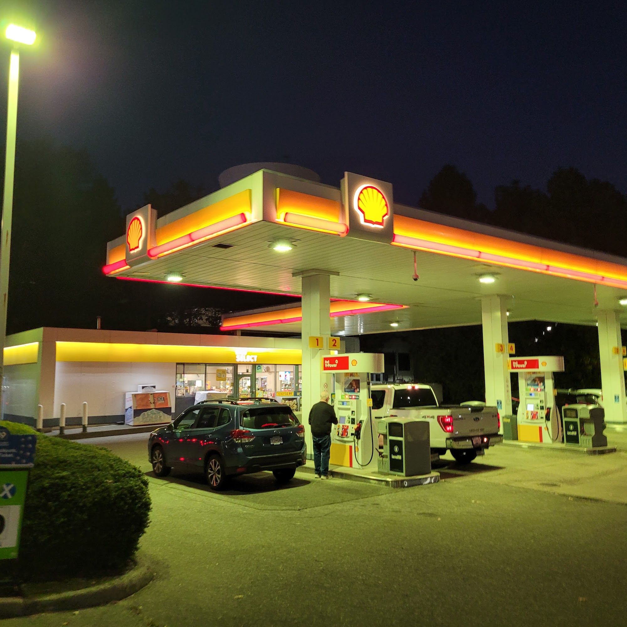 Very convenient location. Have been coming by this location for many years as it's near my work. Three cents off a liter if you're a bcaa member and they give air miles. One of the few hydrogen stations around if you happen to drive a hydrogen car. Has a convenience store and decent coffee