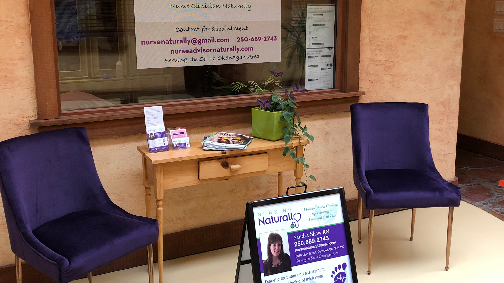 Nursing Naturally can be found in Osoyoos, in the heart of town. It’s offices are located on the main floor in the beautiful Chase Valley Building at 8319 Main St. Nursing Naturally’s services are both office based or provided in your home. Primary services are foot & toenail care for individuals experiencing problems such as overgrown & ingrown nails, callouses, corns, diabetic foot care and wound care management. Other nursing services are relaxation massage, reflexology and lifestyle medicine education. Nursing Naturally also provides palliative, respite and companion services. Please call for an appointment.