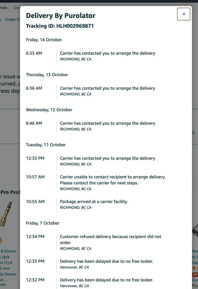 Same issue as everyone else. I was home AND there was a concierge at the door but Purolator states no one was home during their "attempt" at delivery. Had to drive 25 minutes to Richmond to pick up a package that they were paid to deliver.