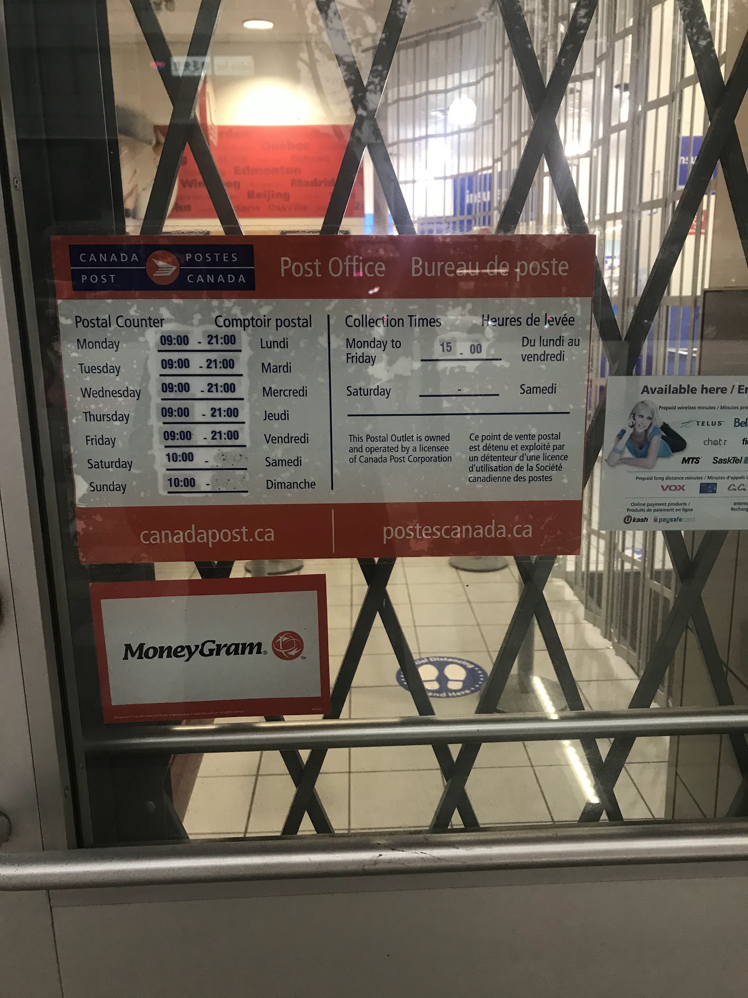 Post Office location offering full range of Canada Post services including package and mail sending across Canada, the U.S. and Internationally. MoneyGram service and PO Boxes available as well as gift and reloadable cards. Stamps and Mint coins available. / Bureau de poste offrant la gamme complète de services de Postes Canada, y compris l'expédition au Canada et ailleurs, ainsi que le service MoneyGram, les cases postales, les cartes-cadeaux, les cartes rechargeables, les timbres et les pièces de monnaie.