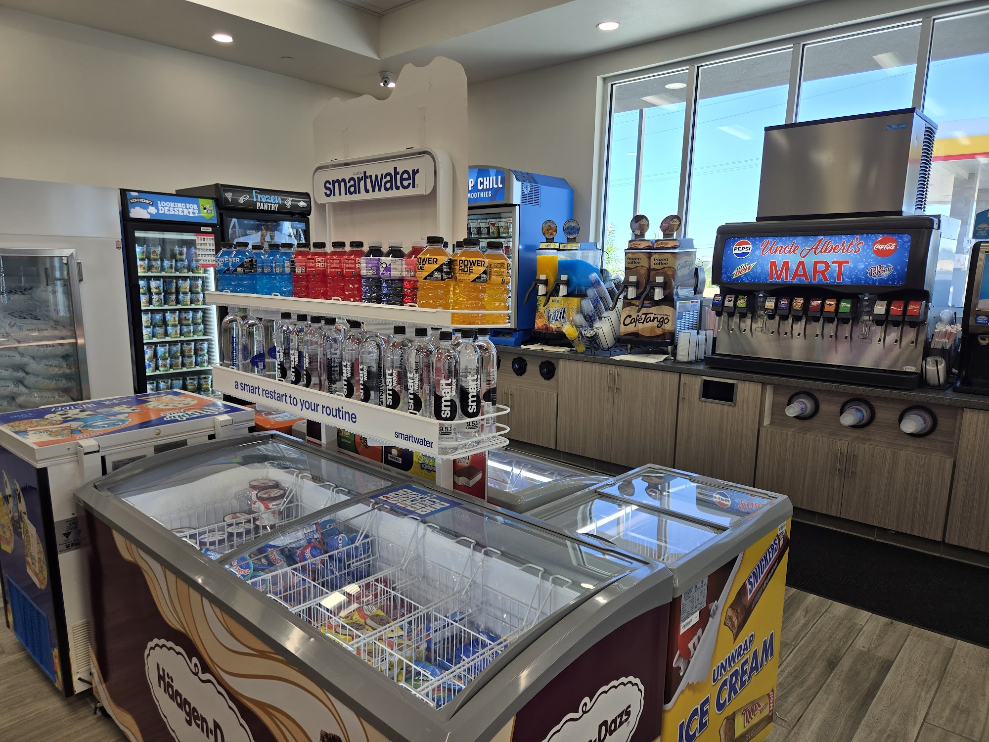 Uncle Albert's Mart is a great new gas station and well-stocked minimart. It is a wonderful place to stop by to fill up on gas, snacks, alcohol, and just about everything else. The selection is huge and insane, including wine, beer, liquor, cigars, ice cream, fish bait, dairy products, and lottery tickets. The place is clean, well-lit, and has that nice new smell. The staff and all employees are friendly, helpful, professional, and know how to treat others. While the fuel is not the cheapest, it is quality Shell fuel. It is a great shop and worth a stop.