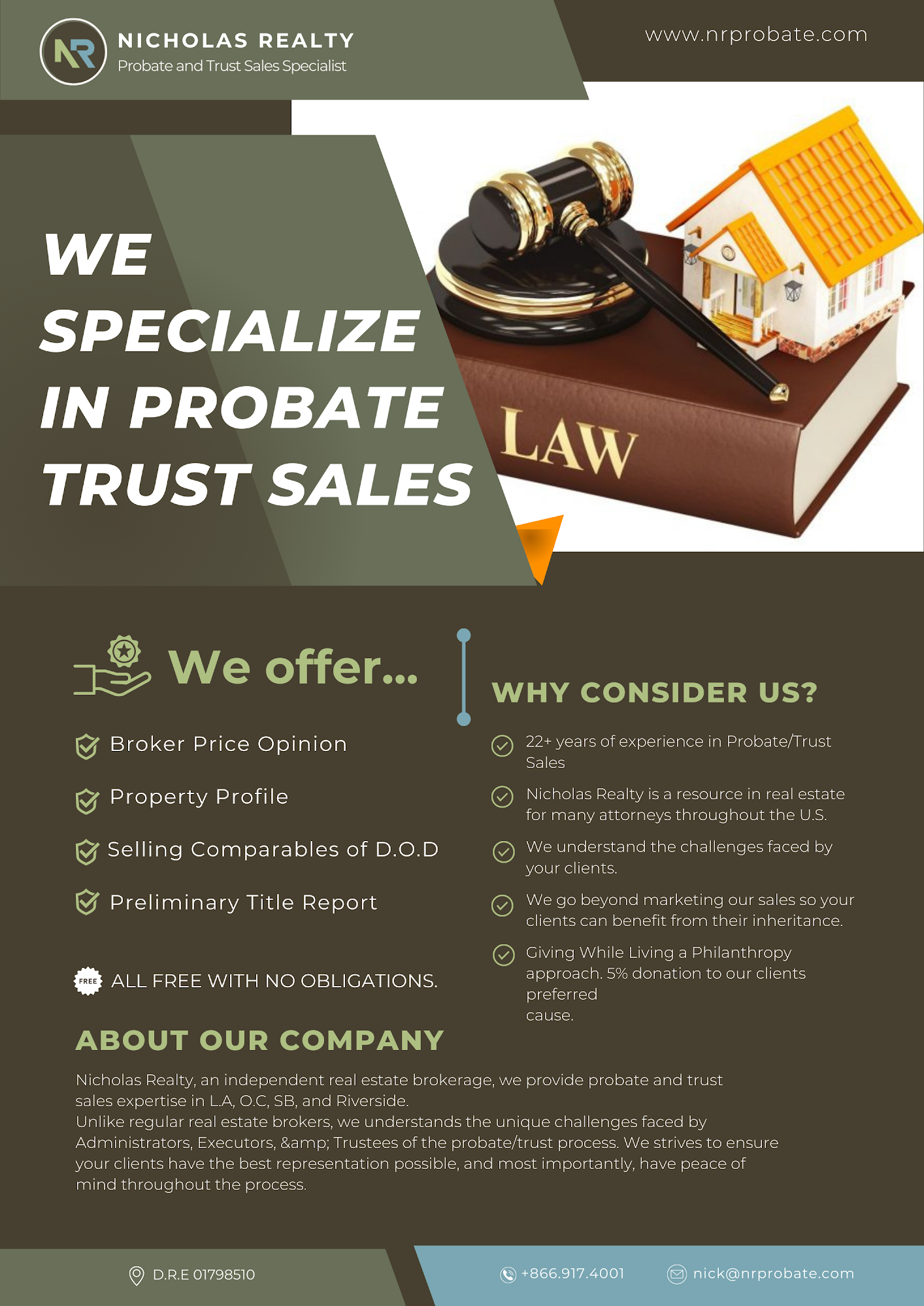 Nicholas Realty is a trusted probate realtor with over 20 years of experience. We serving for the area Los angels, San Bernardino, Reverside and Orange County. We specialize in probate real estate sales, property valuation, estate property management, and trust and estate sales. Our team is dedicated to providing compassionate and professional services, guiding clients through the complexities of the probate process. Whether you need market analysis, home staging, or property cleanup and preparation, we offer comprehensive solutions to ensure a smooth and successful real estate transaction. Contact us for expert consultation and personalized support in managing your probate real estate needs.