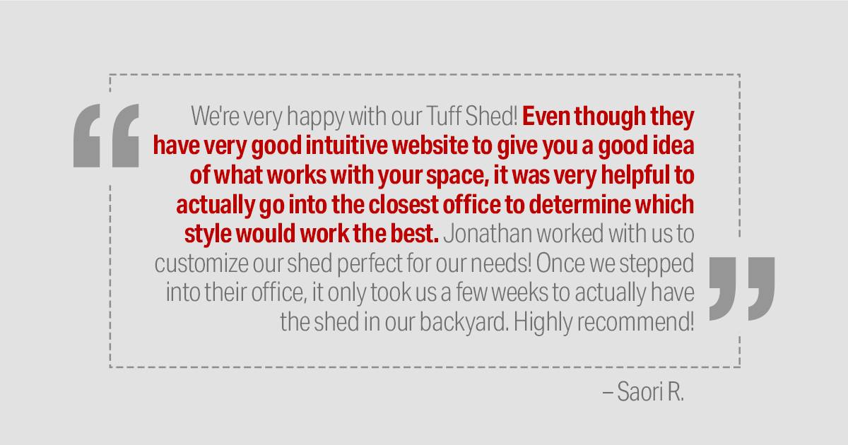 Very happy with my Tuff Shed. Luis Rodriguez was very helpful with this purchase. The guys who installed the shed were courteous and respectful of my property. Thx!