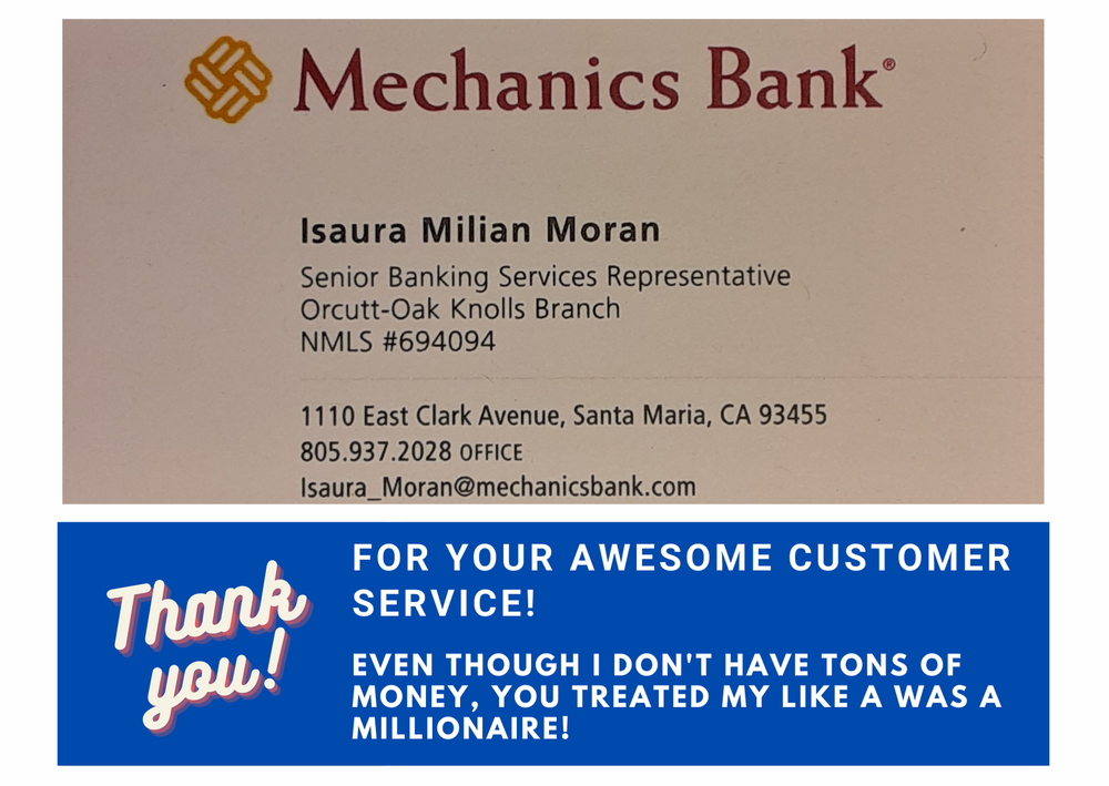 I have accounts with Mechanics Bank so when I needed a document notarized I went to Mechanics Bank. Nicole Olaphant (sp?) helped me and was kind, efficient and helpful. She was a pleasure and very gracious. You are lucky (or smart) to have her working for you.Sincerely,Linda Frey