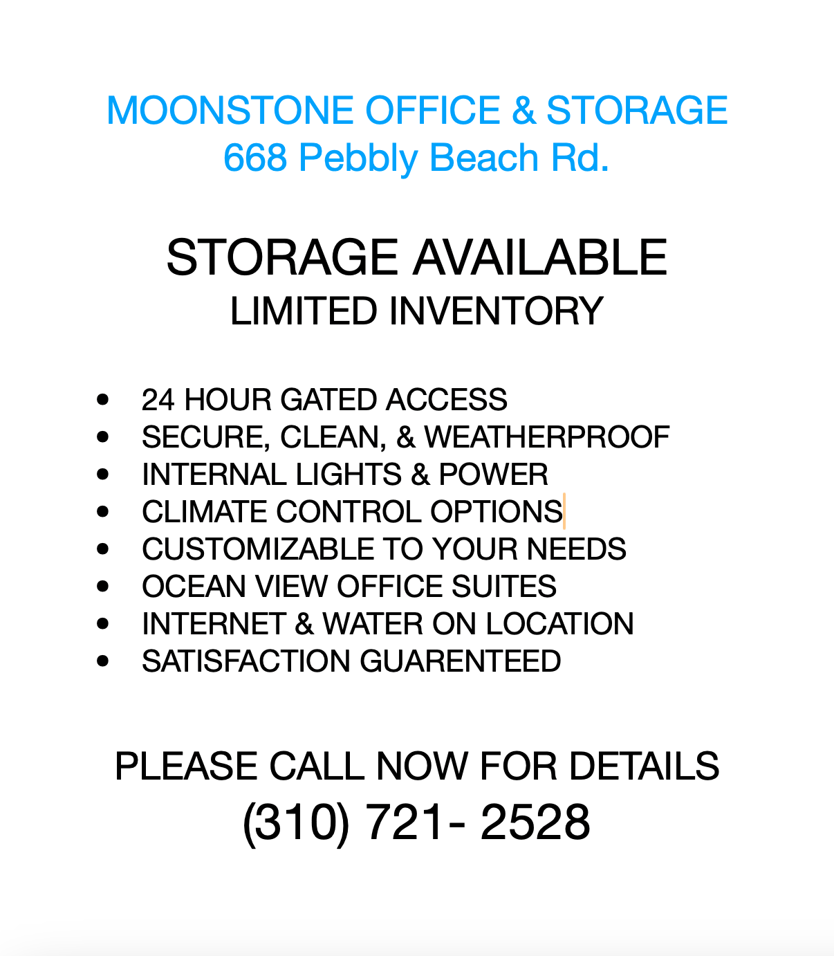 Moonstone Office and Storage is hands down the best option for a wide range of needs from storage to light industrial uses . Located at cool and coastal Pebbly Beach, the facility is meticulously maintained and the owner responsive to individual needs. Colorful gardens add an extra touch. Highly recommended