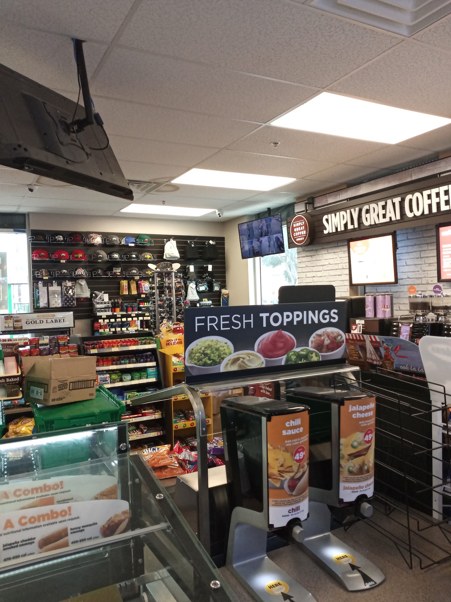 Small gas station with typical snacks, drinks and ice creme offerings. California lotto machine. Tiny Burger King inside too.