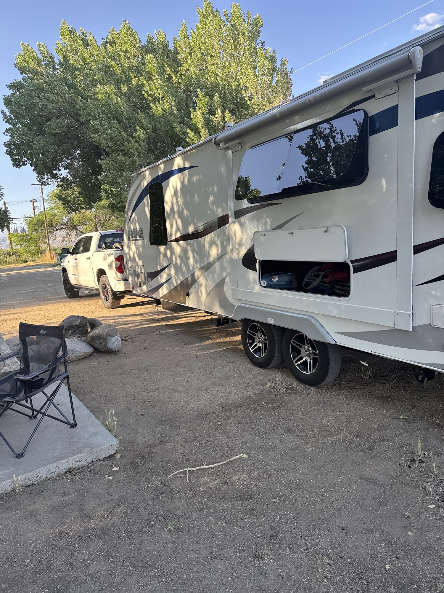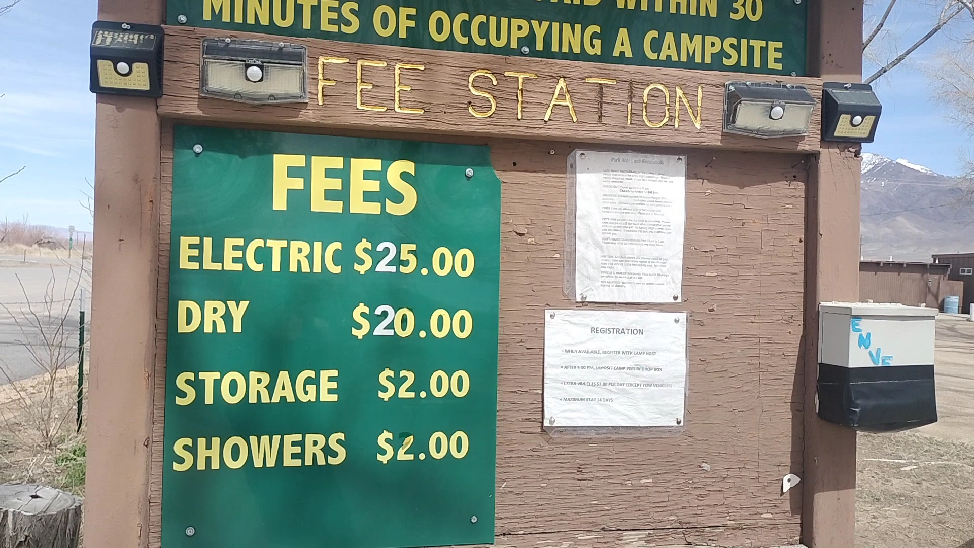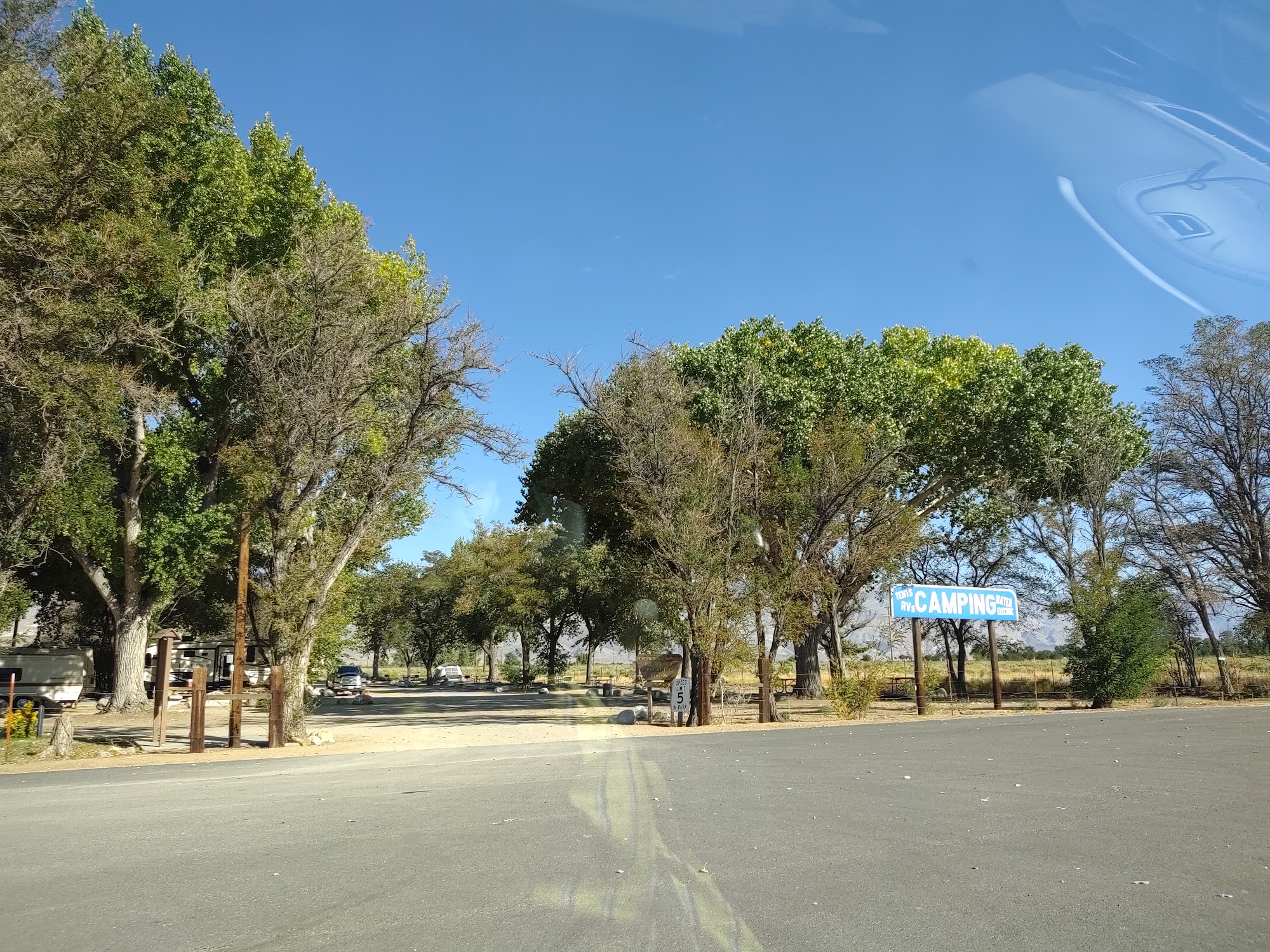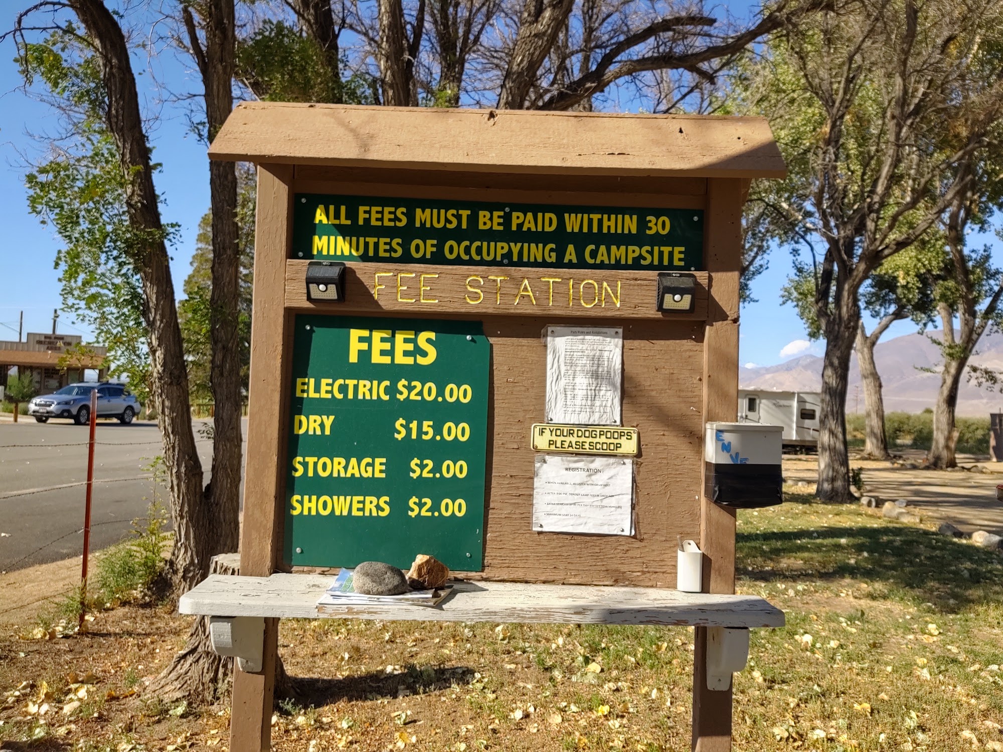 RV camp E$25./W/Shower$2. Old pay shower machine, hot water.Park and go up 23mi up to Bristlecone trails.Road noise off Rt395.Camp host not in till evening.