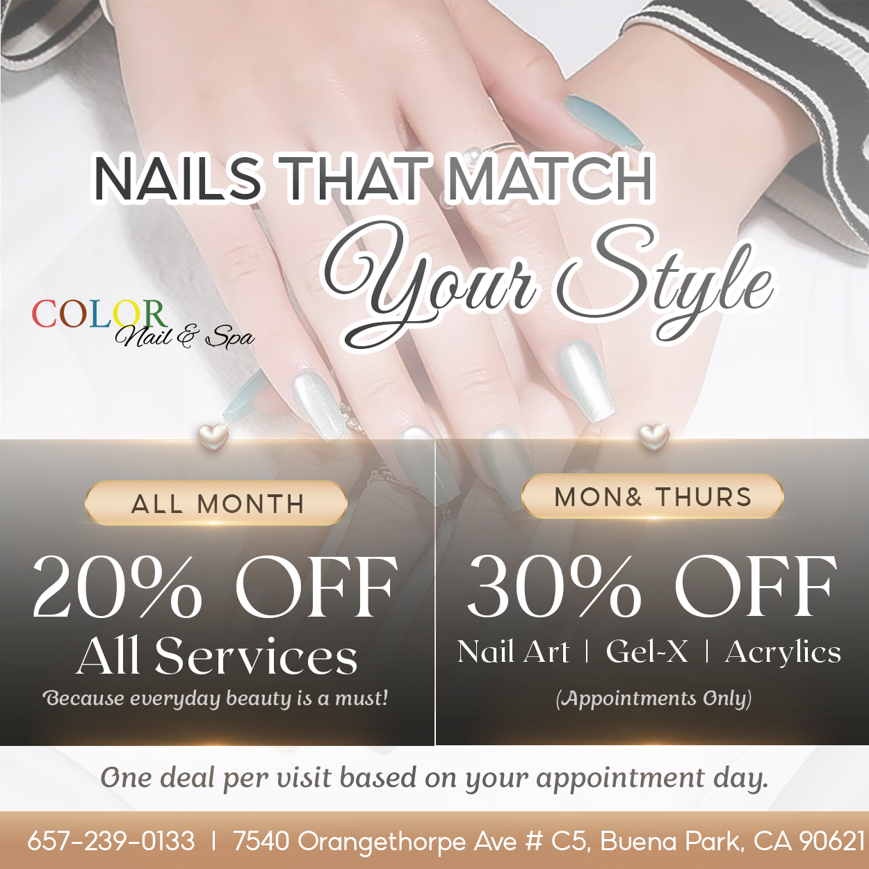 Color Nail and Spa is a full-service nail salon in Buena Park, CA, committed to bringing out the extraordinary in you! From the moment you set foot in our establishment to the moment you depart, we will provide you with a total beauty regimen and the individual service you deserve. In addition, our beauty technicians stay updated on the latest trends and techniques to bring you the looks you want through ongoing education.