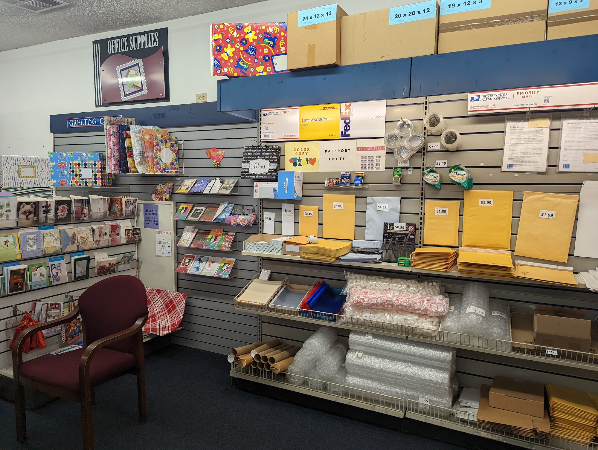 Very friendly busssiness owner, he guides you to understand your needs. My always to go stop to help with any mail and live scans. Usually not alot of wait which makes it great.