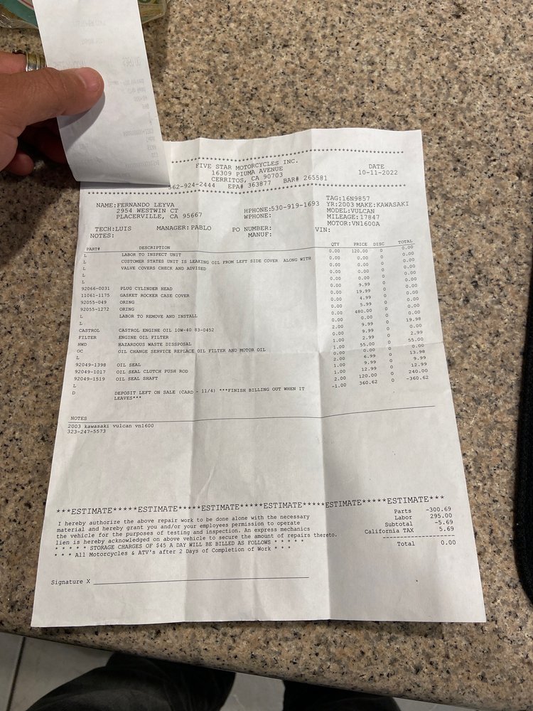 Brought my bike in for that 1,000 miles service and the team over at 5 star still getting me in and out with excellent service. Thanks guys!