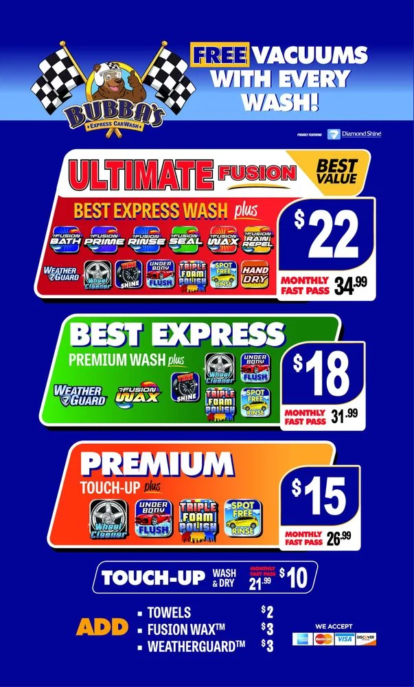 Bubba's Express Car Wash offers a quick and convenient car wash experience, taking only three minutes to complete. Every wash includes free vacuums, making it easy for customers to finish cleaning their cars inside and out. The staff is friendly, professional, and always willing to help, often going above and beyond to ensure customer satisfaction. Many customers are impressed with the quality of the wash, noting that it surpasses other places like Quick Quack. The full-service option is thorough, even cleaning the inside of the car without missing a spot. Prices are affordable, and the business offers unlimited car wash plans to help protect the car's finish and boost resale value. Customers appreciate the effort the staff puts into delivering a high-quality service and the kindness they receive during their visits. Overall, Bubba's is praised for its excellent service, quality, and fast, reliable wash experience.