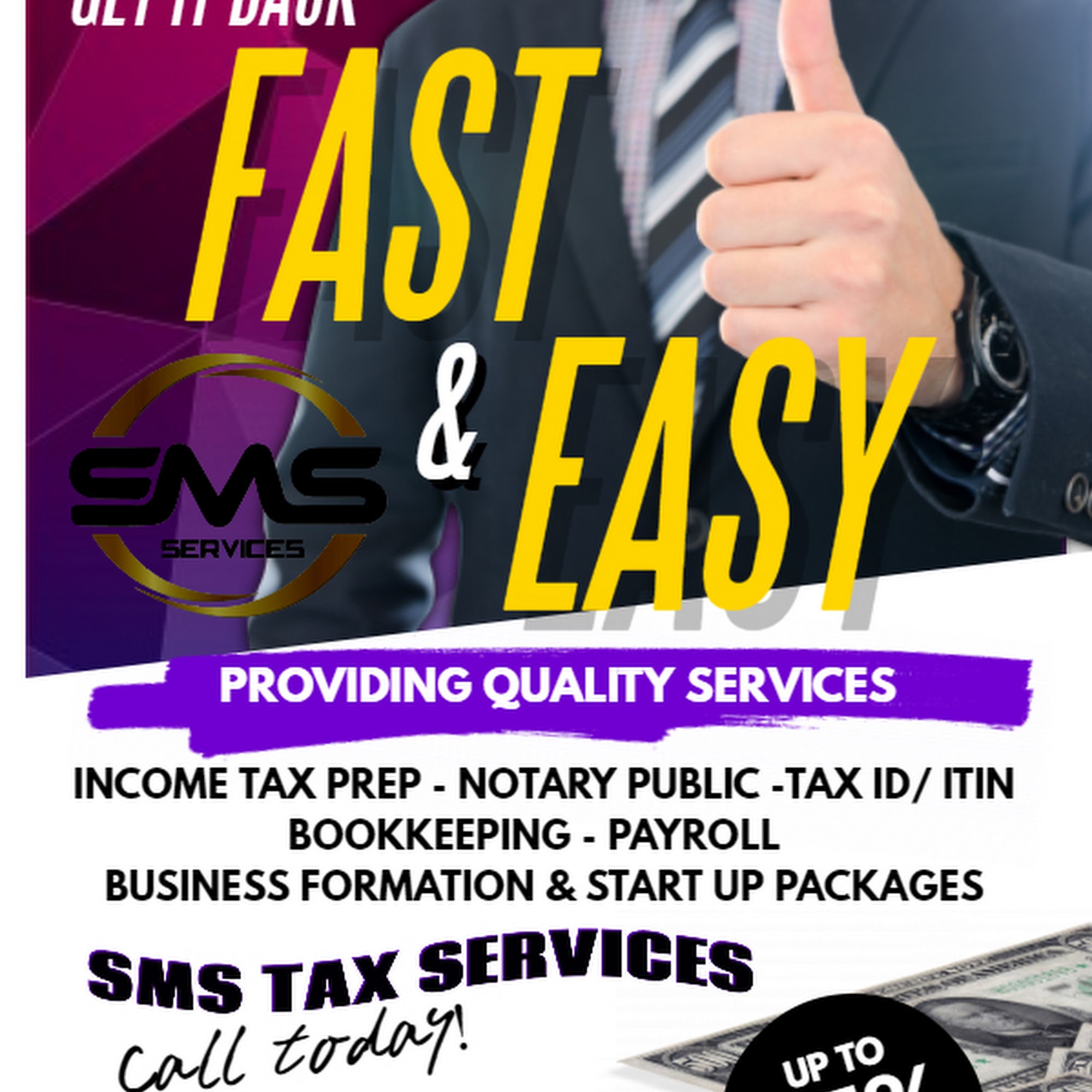 SMS Services is a reliable and professional business that provides easy and fast tax filing services. Customers have been working with them for several years, praising their knowledgeable and friendly staff. The team consistently offers helpful, efficient, and accurate service, making the process simple and stress-free. Many reviews mention that the staff take the time to answer questions and handle work quickly, demonstrating their dedication and expertise. First-time clients have appreciated how easy it was to work with SMS Services, and repeat customers continue to recommend them highly. Overall, SMS Services is known for its dependable service, friendly team, and commitment to making tax and accounting needs straightforward and convenient.