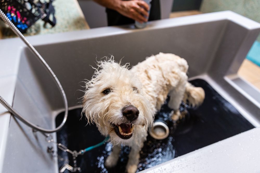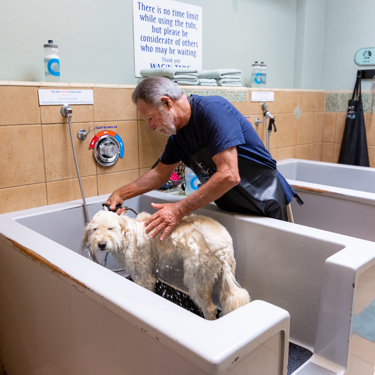 Great place to wash your best friend. Able to control the water temperature instead of just freezing cold. It's quiet and perfect for your best friend. Towels, soap, brushes and dryer included in the wash.