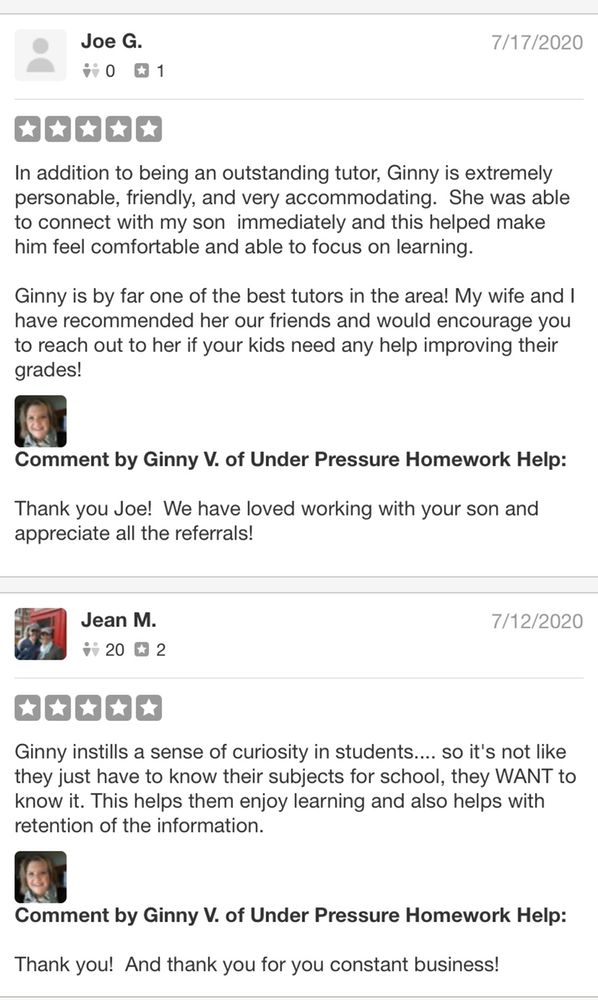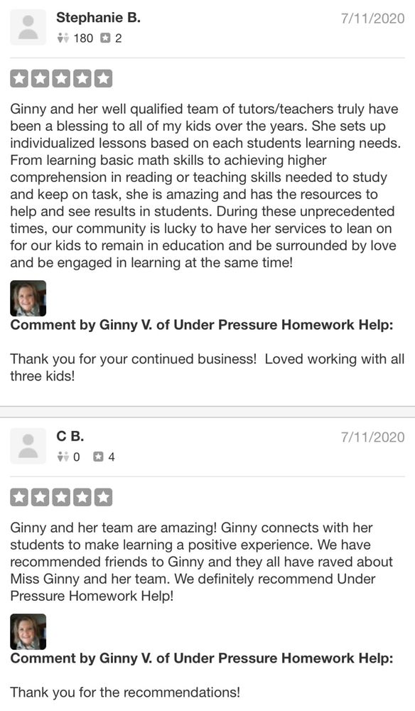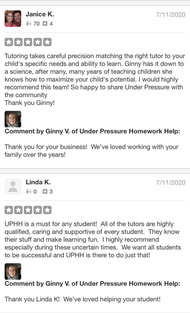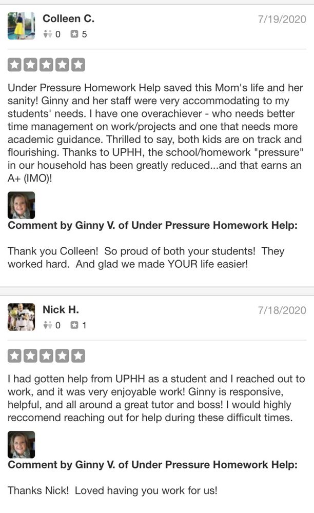 Under Pressure Homework Help has truly eased the pressure my child was feeling about math. Since her first visit she felt happier and more confident. This is money well spent!