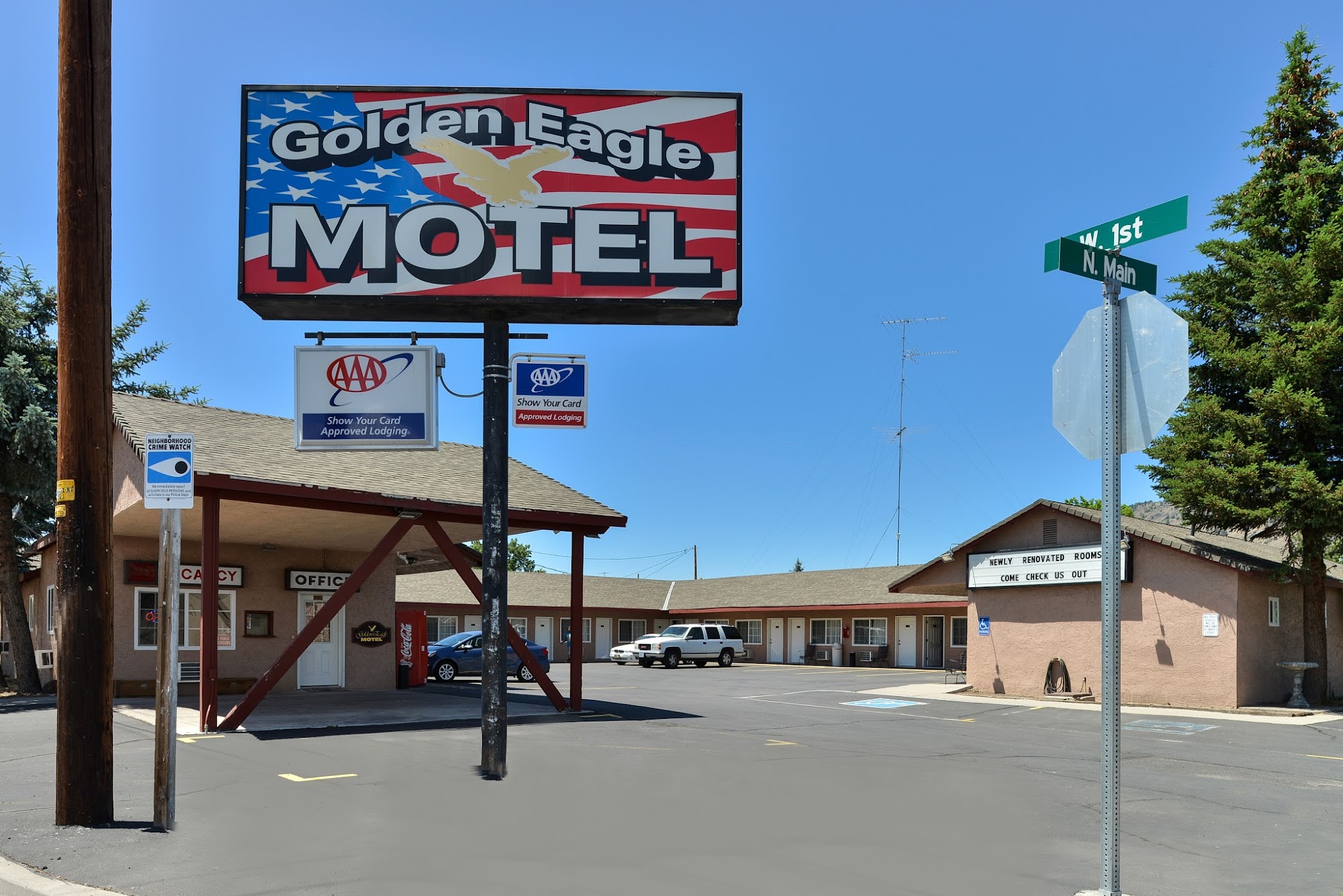 The Golden Eagle Motel is a small, budget-friendly accommodation located in a quiet mountain town. Despite being an older property, the motel is consistently praised for its cleanliness and good value. Rooms are simple but comfortable, often equipped with a refrigerator, microwave, and plenty of TV channels. The beds are comfortable, and the sheets are clean. Guests appreciate the friendly and attentive staff, who are helpful and hospitable. The rooms are generally well-maintained, with safe, well-lit outside areas, making it a good place for travelers seeking a relaxing stay. Some reviews mention minor issues like harsh lighting, slightly less clean carpets, or static on the TV, but these do not detract significantly from the overall experience. The location is convenient, situated on the main drag near a mini-mart and a popular Mexican restaurant. The area offers great hiking and fishing opportunities, and travelers can enjoy nearby attractions like lava beds caves and Crater Lake. Many guests find the motel to be a great value, especially given the affordable prices, often under $50 per night. Visitors also note the helpfulness of staff, with one guest grateful for assistance backing up a trailer. The motel provides basic amenities and a safe, clean environment, making it a good choice for those passing through or looking for a peaceful, budget-friendly stay in this scenic area.