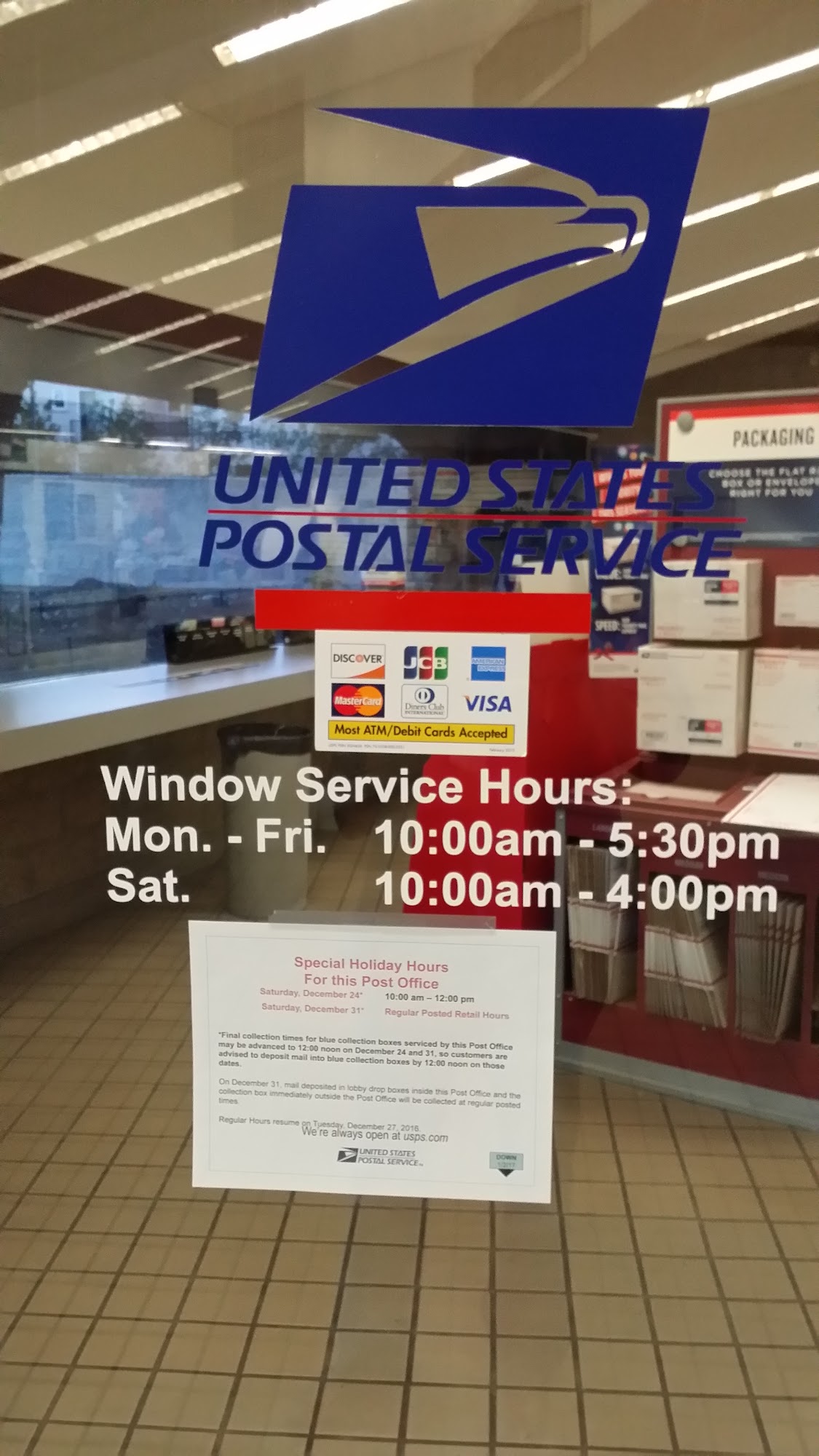 It's a fine post office, closest to where I live. However they removed the 2 outside mailboxes, and locked the doors on Sundays so you can't access the inside drop-off. Would be nice to have an option to at least drop off mail on a Sunday. Maybe this review will save others a fruitless trip.