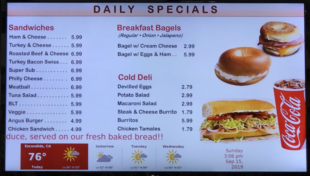 We have a selection of cold deli products, breakfast bagels and deli sandwiches. We also serve Acai Bowls made fresh daily! Not to forget a wide variety of cold sodas, beer, wine, fountain drinks and snacks! We open at 5am with freshly brewed hot coffee and assorted pastries. One stop shop for all.