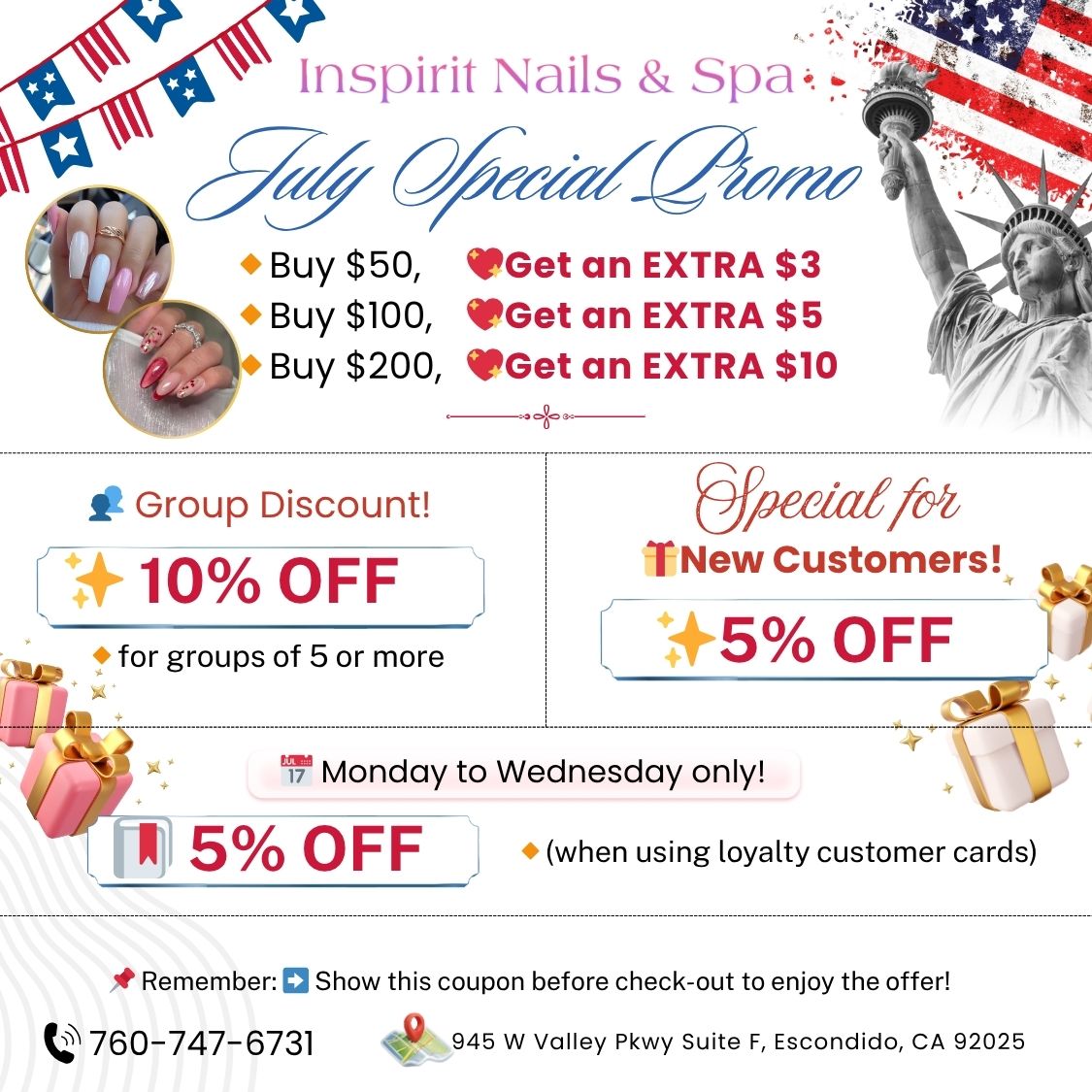 Inspirit Nails & Spa is a beloved nail salon where customers appreciate the attention and devotion to great work. The staff, including the nail technicians, are praised for their friendliness and graciousness. They offer drinks and snacks to customers, making the experience even more pleasant. The nail technicians provide high-quality acrylic gel services that fit the client's nails perfectly. The owner and the entire staff are commended for their welcoming and accommodating nature, making Inspirit Nails & Spa feel like a second home for its clients. Customers appreciate the long-lasting products used at the salon, and the professionalism of the staff. They also appreciate the staff's efforts to communicate in English as much as possible. The salon is known for its great customer service, with staff members checking on clients and ensuring they are satisfied with the services provided.