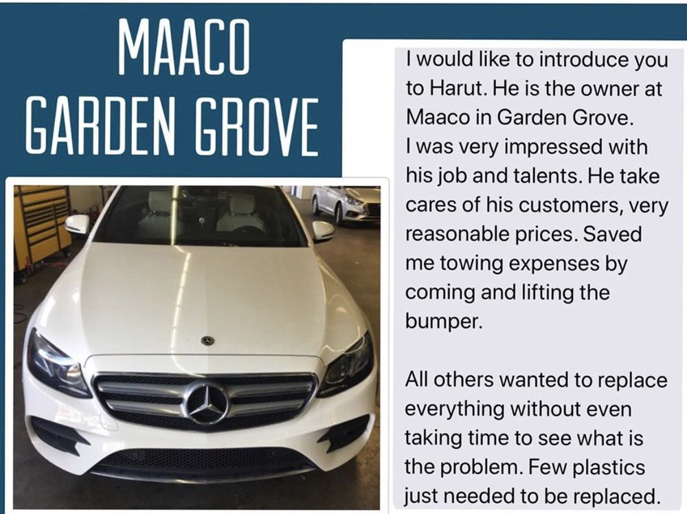 Excellent auto body and paint shop. No cutting corners. Paid attention to the details. Manager was very knowledgeable, honest and helpful. Low to reasonable cost. Very satisfied. For those looking for a paint job on their vehicle, I highly recommend Maaco in Garden Grove, CA.