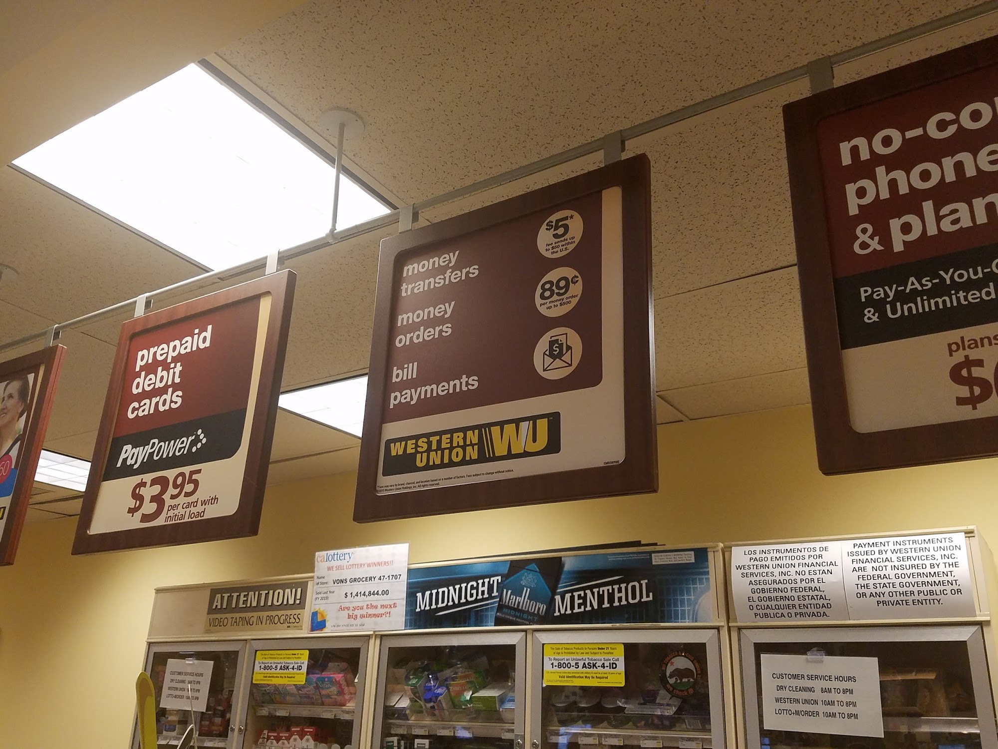 The customer service at Vons told me their Western Union systems have been down for "a while". I recommend calling ahead if you try this one.