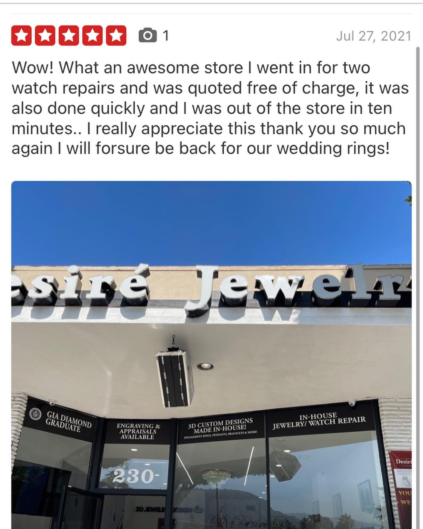A friend highly recommended Desire Jewelry when I needed rings resized, and I'm so glad she did. They did a wonderful job with the rings, and were very friendly and helpful through the process. Wonderful customer service. I will definitely be returning with any future jewelry needs.
