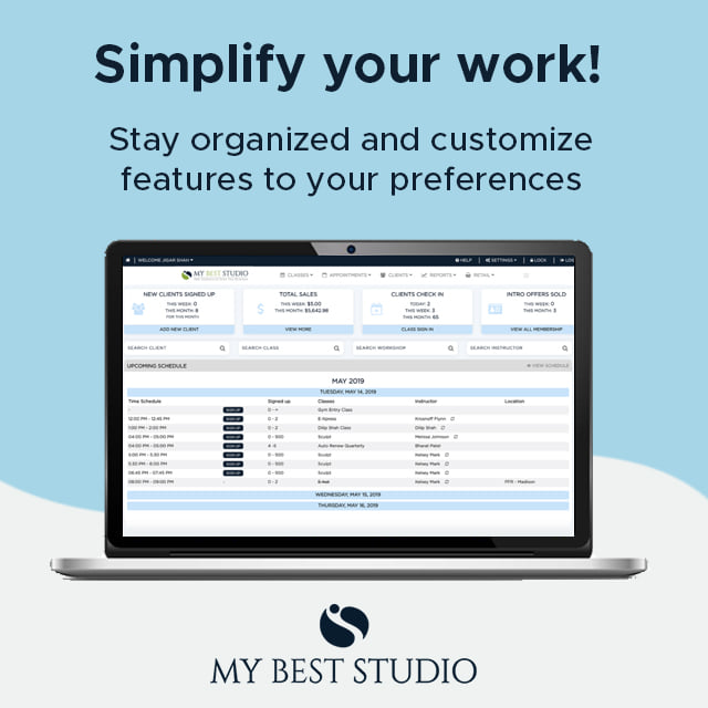 Our Studio Management Software handles all the needs of your studio, from online booking and scheduling appointments, to client and employee management and payment processing.Once you get started with My Best Studio, the flat monthly rate will NOT increase for any reason. Our $55 /month charge is locked-in, meaning that it is not subject to change once you sign up with us.