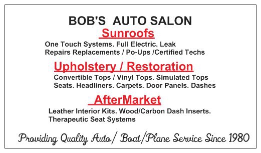 Bob's Auto Salon is a highly regarded auto upholstery business known for its exceptional craftsmanship and quality service. Customers consistently praise Bob for his friendly demeanor, straightforward approach, and dedication to his work. He specializes in a range of services, including convertible tops and classic car upholstery, and is particularly noted for his quick turnaround times, often completing jobs within a single day. Clients have shared positive experiences with a variety of projects, such as replacing headliners and repairing seats, all of which are completed to a high standard. Bob's pricing is competitive, often offering quotes significantly lower than other providers, making him a preferred choice for many. His attention to detail and ability to understand customer needs have led to numerous recommendations and repeat business. While some customers note that finding his location can be challenging, the quality of work and customer service provided by Bob makes the effort worthwhile. Overall, Bob's Auto Salon is a go-to destination for anyone seeking reliable and high-quality auto upholstery services.