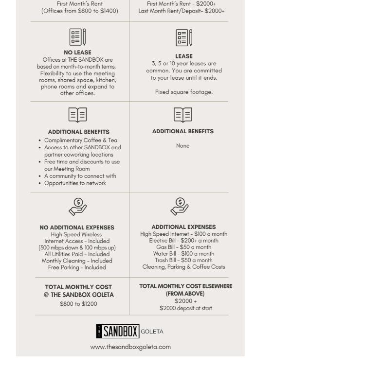 The Sandbox Goleta was a great office space. Staff was friendly and professional. Spaces were clean and other tenants were respectful. No complaints.