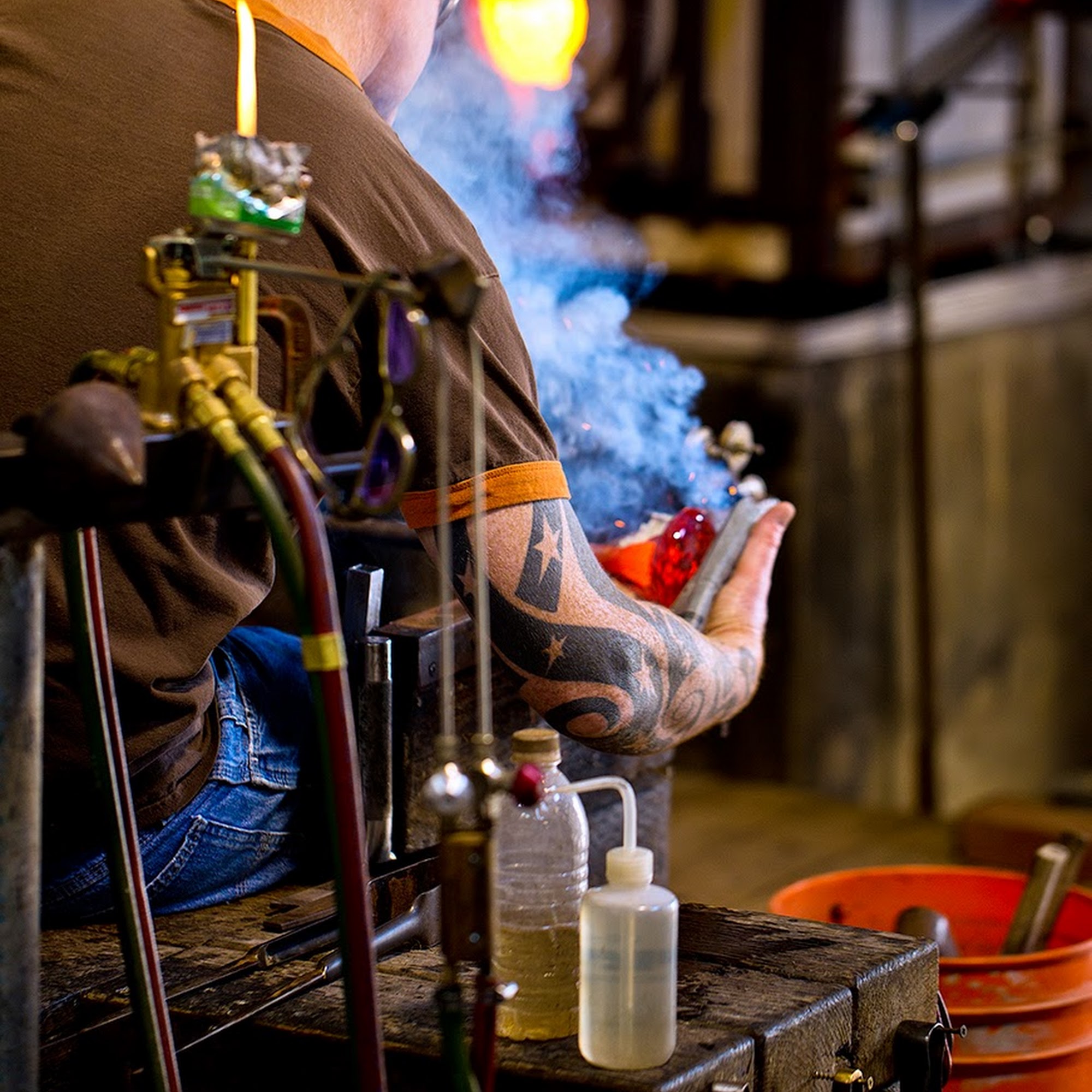 There is quite a selection of glass works here. If the furnace is running you can watch them making some of the items. I believe that they even have lessons where you can try your hand at it. The area is nice and quiet but there are a couple of other shops here as well.