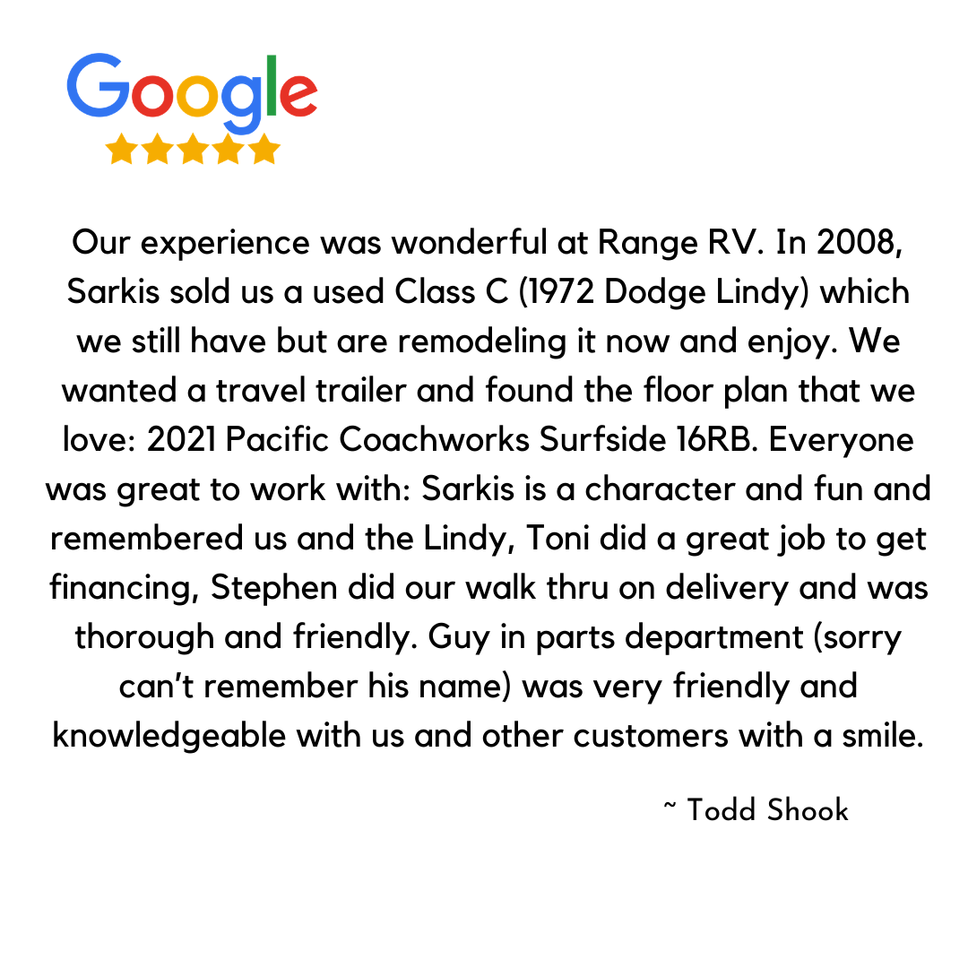 Range RV is your local RV dealer serving the High Desert. Our customers from all over San Bernardino County appreciate our large selection of Travel Trailers, Fifth Wheels, and Toy Haulers from brand leaders such as Forest River, and Pacific Coachworks. We carry all major RV brands and service them in house in our drive thru service center. Our Hesperia RV dealership has been helping families make memories for 49 years. We are big enough to have everything you need, but small enough to know you by name when you visit.