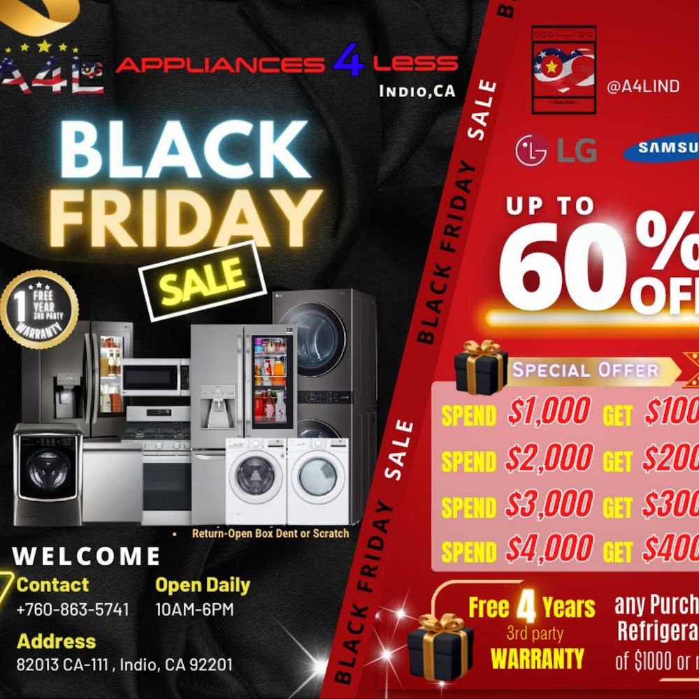 Soft Opening Welcome! Appliances 4 Less Indio offers a wide inventory of popular home appliances at a discounted price. Our inventory includes never used and fully functional refrigerators, microwaves, dishwashers, washers, dryers and stovetops with minor cosmetic scratches and dents. Each appliance comes with free1 year third warranty , delivery is available and installation options.