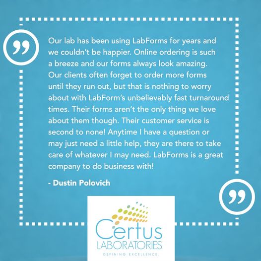 LabForms is a full-service custom forms house for the medical industry. We do everything from simple 1-color forms to 4-color with labels, barcoding (including 2D barcoding), perforations and more! With more than 20 years of experience in the print and design field, you can trust LabForms to complete your form requests correctly and on time.