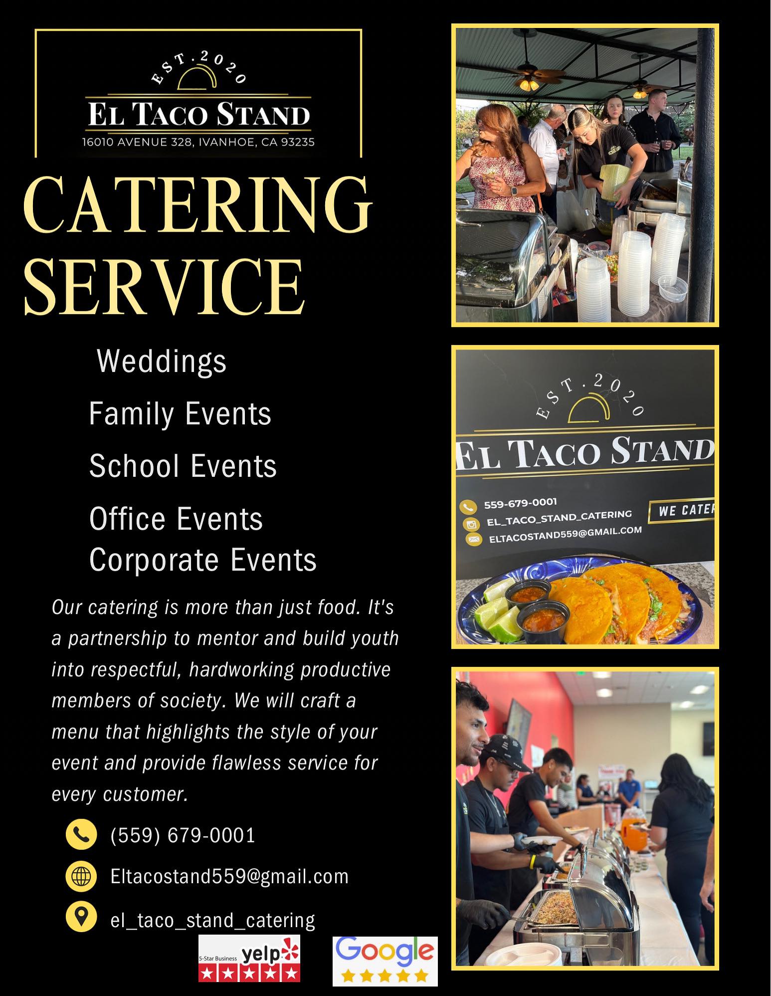 El Taco Stand offers fantastic tacos and burritos in a welcoming, beautiful environment. The service is fast and friendly, with the staff accommodating customized orders and providing a wide range of toppings. Customers praise the amazing food quality, great customer service, and the business's support for the local community. Overall, El Taco Stand is highly recommended for both dine-in and catering services.