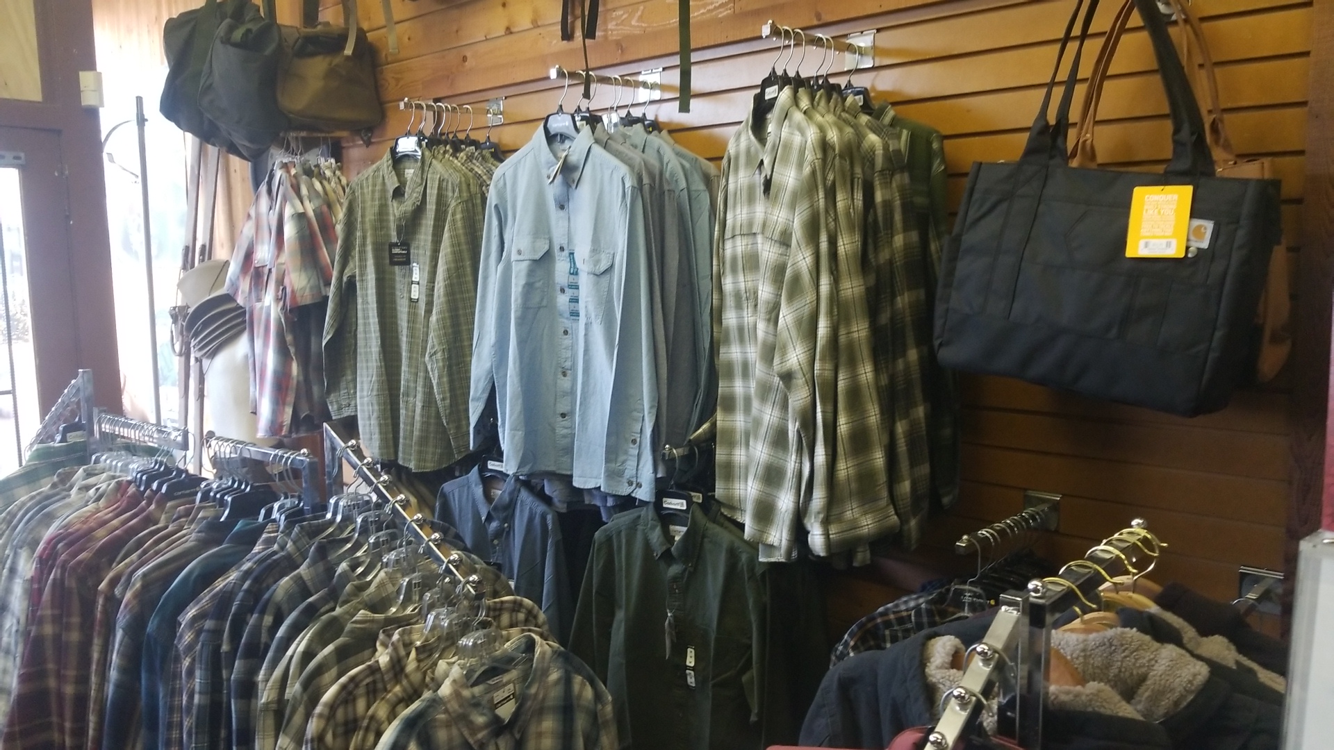 Lots of Carhartt brand clothes and bags here. All beautiful. Reasonable prices. Owners are also nice. Good.
