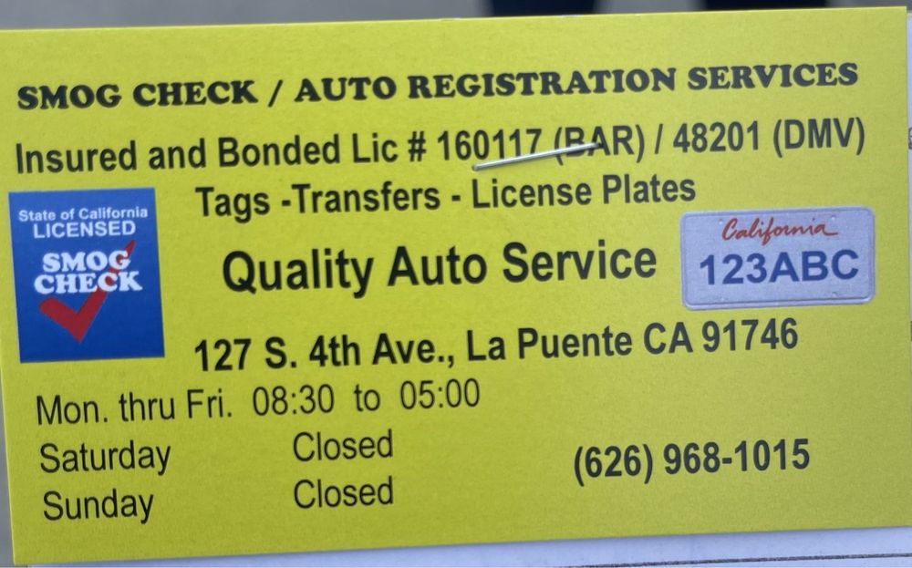 Quality Auto Services provides fast and professional smog checks. The owner is kind and pleasant, completing inspections quickly, often in 15 to 30 minutes. The service is reasonably priced, around $70. The office is very clean and offers a selection of free cookbooks. No appointment is needed, and customers report a great experience, consistently passing their tests with this efficient and reliable service.