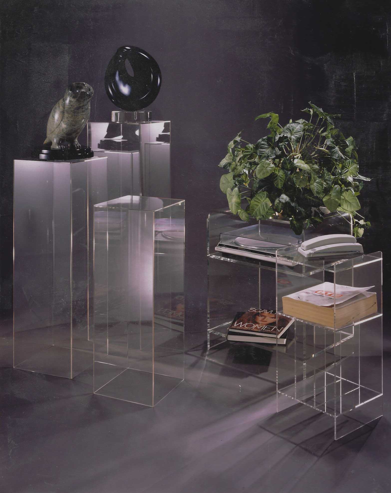 We work mainly in acrylic, but we also have ABS and Polycarbonate. Our main line of products is furniture but we also do framing of art and mount art on acrylic blocks. We ship all over the country all of our products. We have an ETSY store also if you would like to check out some of our products. We do a lot of custom work so don't be afraid to ask about customizing one of our products or if you have a sketch or picture of what you would like please send it to us and we will quote it for you.