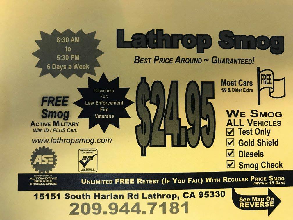 Lathrop Smog is a local auto repair shop that offers a variety of services, including smog checks, tune-ups, oil changes, and more. The owner is described as very nice and provides great service. The shop is known for its quick turnaround, with customers often getting in and out in 15-30 minutes. Customers appreciate the owner's straightforward and helpful approach, as well as the competitive pricing, especially with online discounts. Despite the growing business and increased busyness, Lathrop Smog maintains its commitment to quality service and customer satisfaction, making it a highly recommended local option for smog and auto repairs.