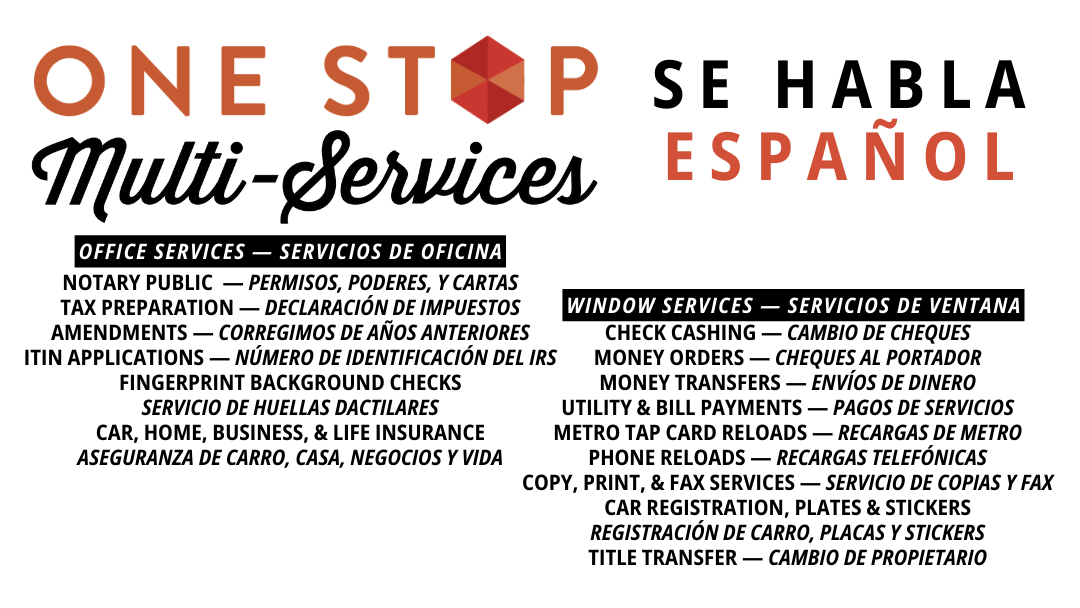 We have been serving Long Beach residents with a variety of services for over 15 years. We offer a variety of services such as: check cashing, money transfers, money orders, utility and bill payments, metro tap reloads, phone reloads, copy, fax, email, scan, and print services. We also offer same-day stickers, plates, registration renewals, title transfers, and DMV registration paperwork. Visit our office suites next door for tax preparation, tax consulting, immigration, green card applications and renewals, I-90 applications, livescan, and fingerprinting services. Our variety of services are available inside Santa Fe 1 Stop Market on 2456 Santa Fe Ave., Long Beach, CA 90810 at the teller windows, and in our private office suites.